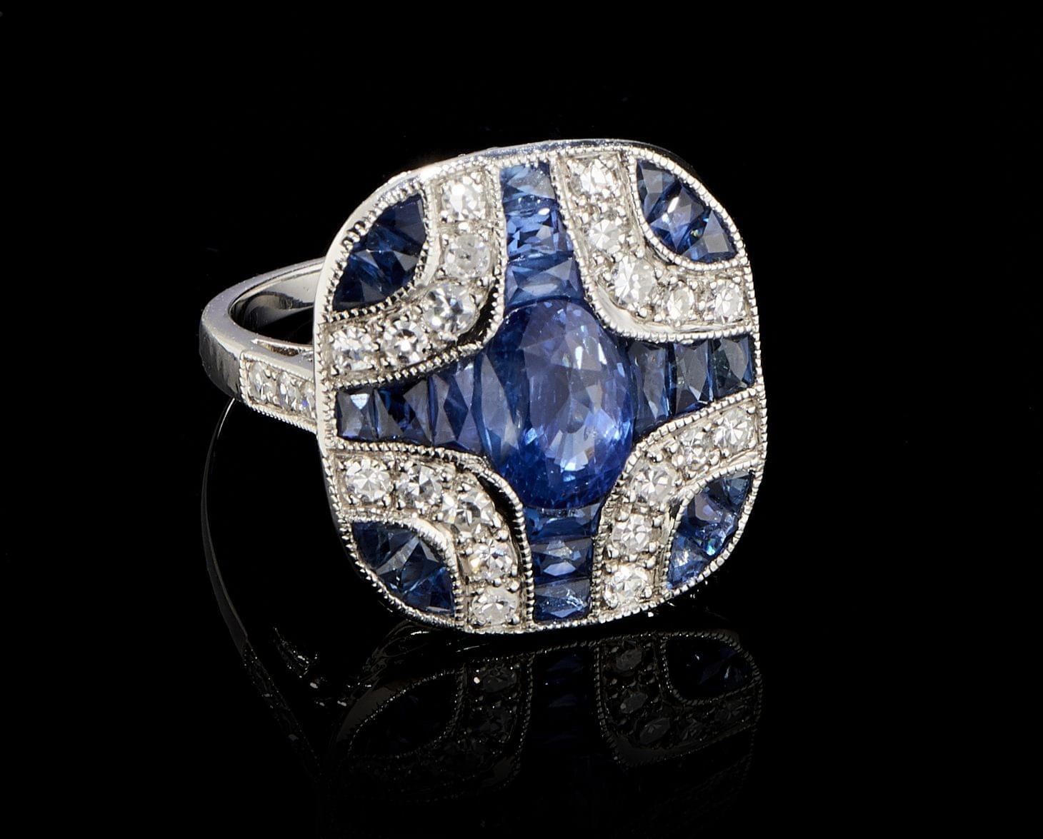 68. Bague Art déco à motif de fleurs centrée d'un saphir taille cabo...