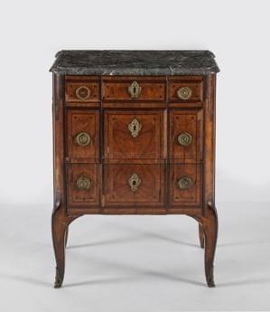 Bois de rose et bois de violette, trois tiroirs, marbre vert aub...