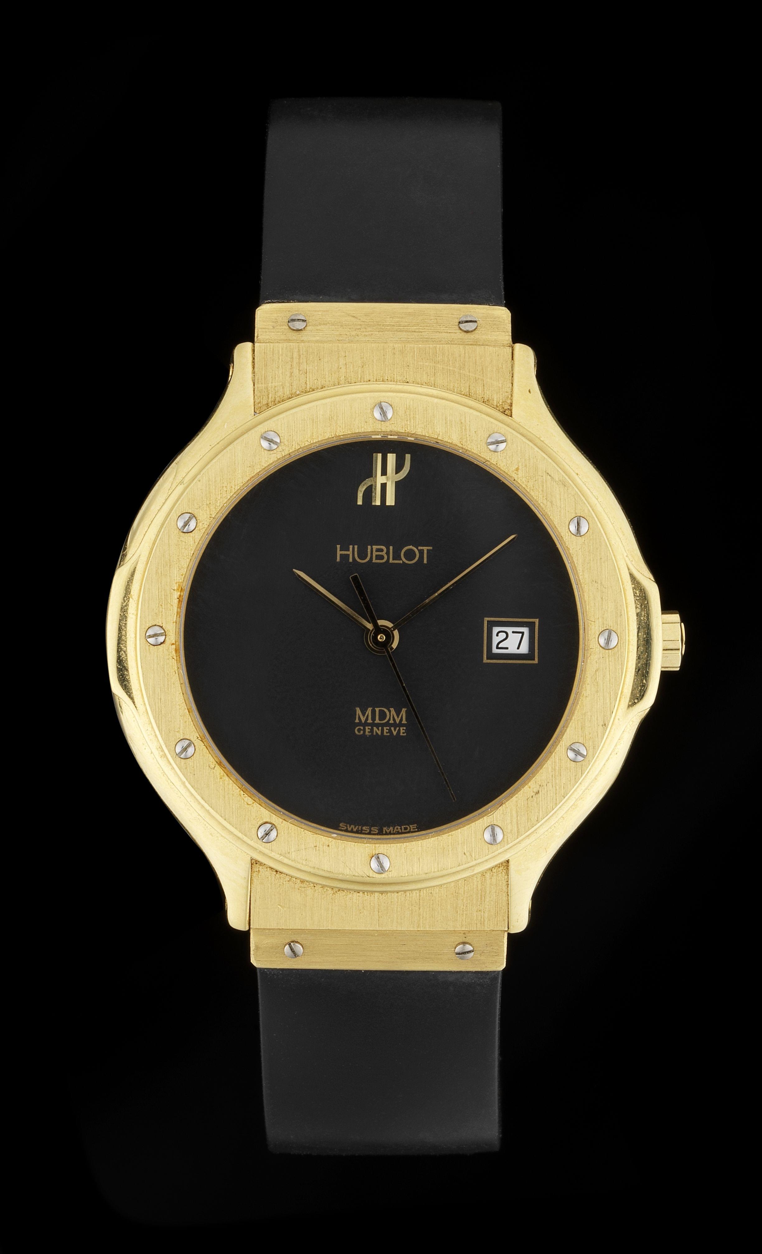 Cadran noir, aiguilles dorées, date à guichet à 3h, or 750, L env. 17 cm, D 33 mm, poids brut 51 g