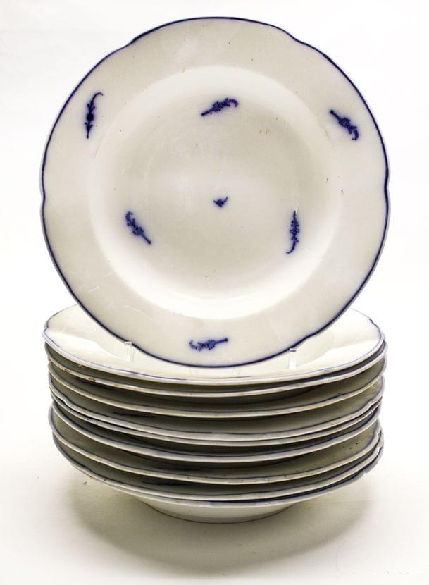 3266. 12 assiettes à décor blanc bleu de brindilles