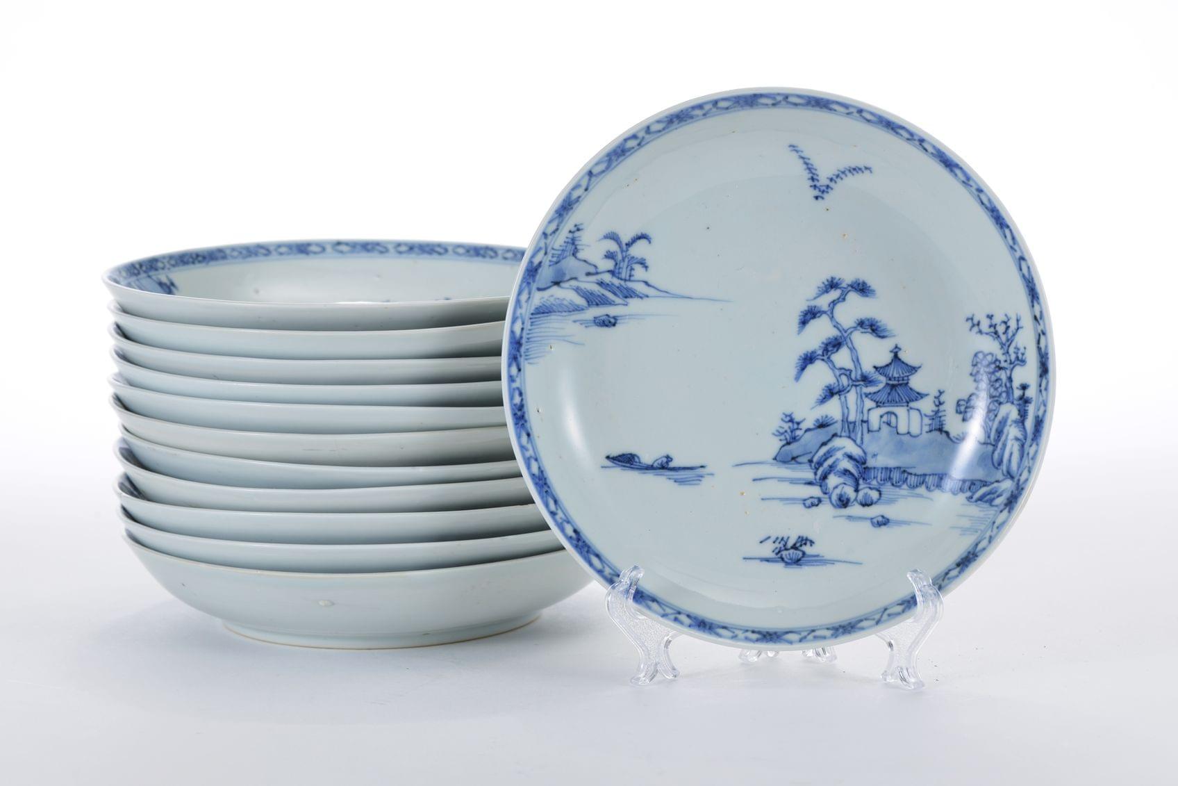 Décor bleu blanc de pavillon sous un pin et batelier sur une rivière survolée par des oies, Chine circa 1750 pour la Compagnie des Indes, porcelaine, D 18 cm. Provenance: Nanking Cargo, Vente Christie's Amsterdam, 28 avril - 2 mai 1986, lots 2694 et 2695 partiels