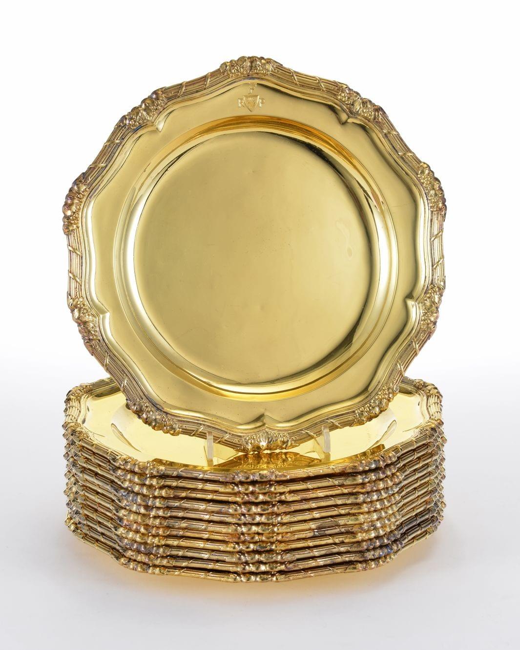 198. 12 assiettes plates festonnées à bordure de filet et ruban rythmé d'acanthes et grappes d'époque George III