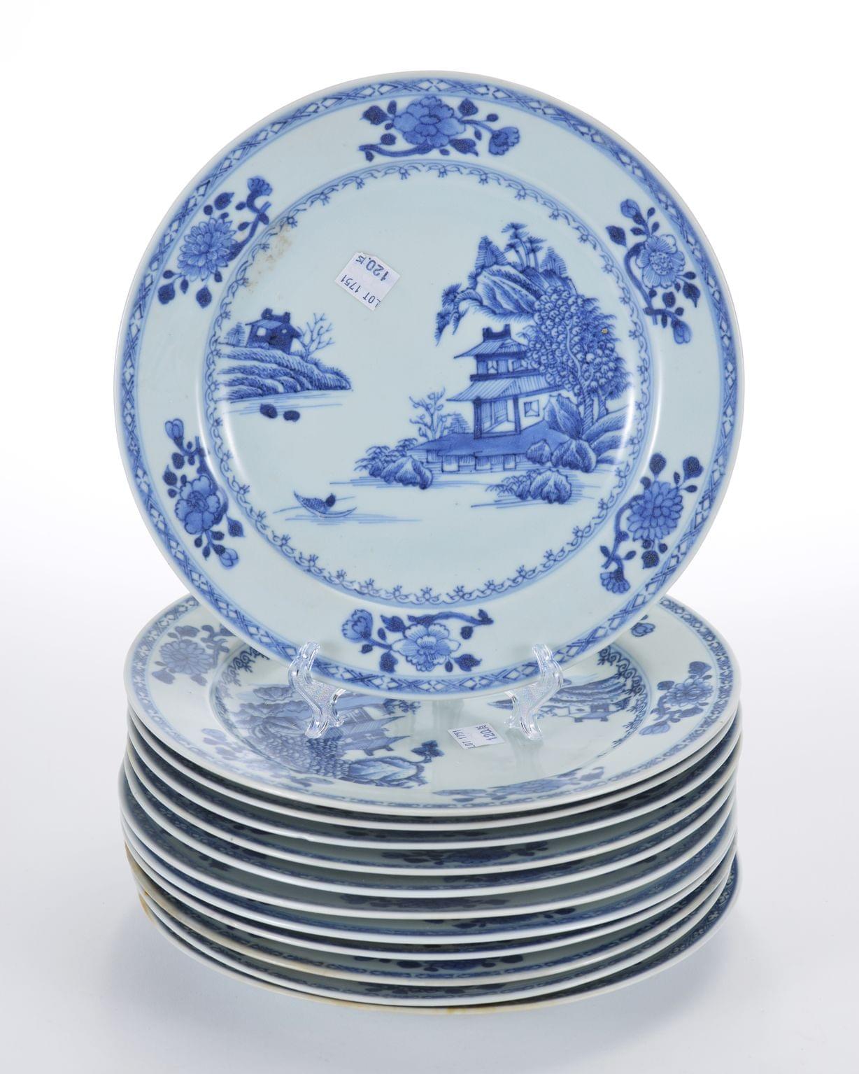 Décor bleu blanc de pavillons sous les pins et batelier sur une rivière, le marli décoré de six fleurs, Chine circa 1750 pour la Compagnie des Indes, porcelaine, D 23. Provenance: Nanking Cargo, Vente Christie's Amsterdam, 28 avril - 2 mai 1986, lot 1751 partiel