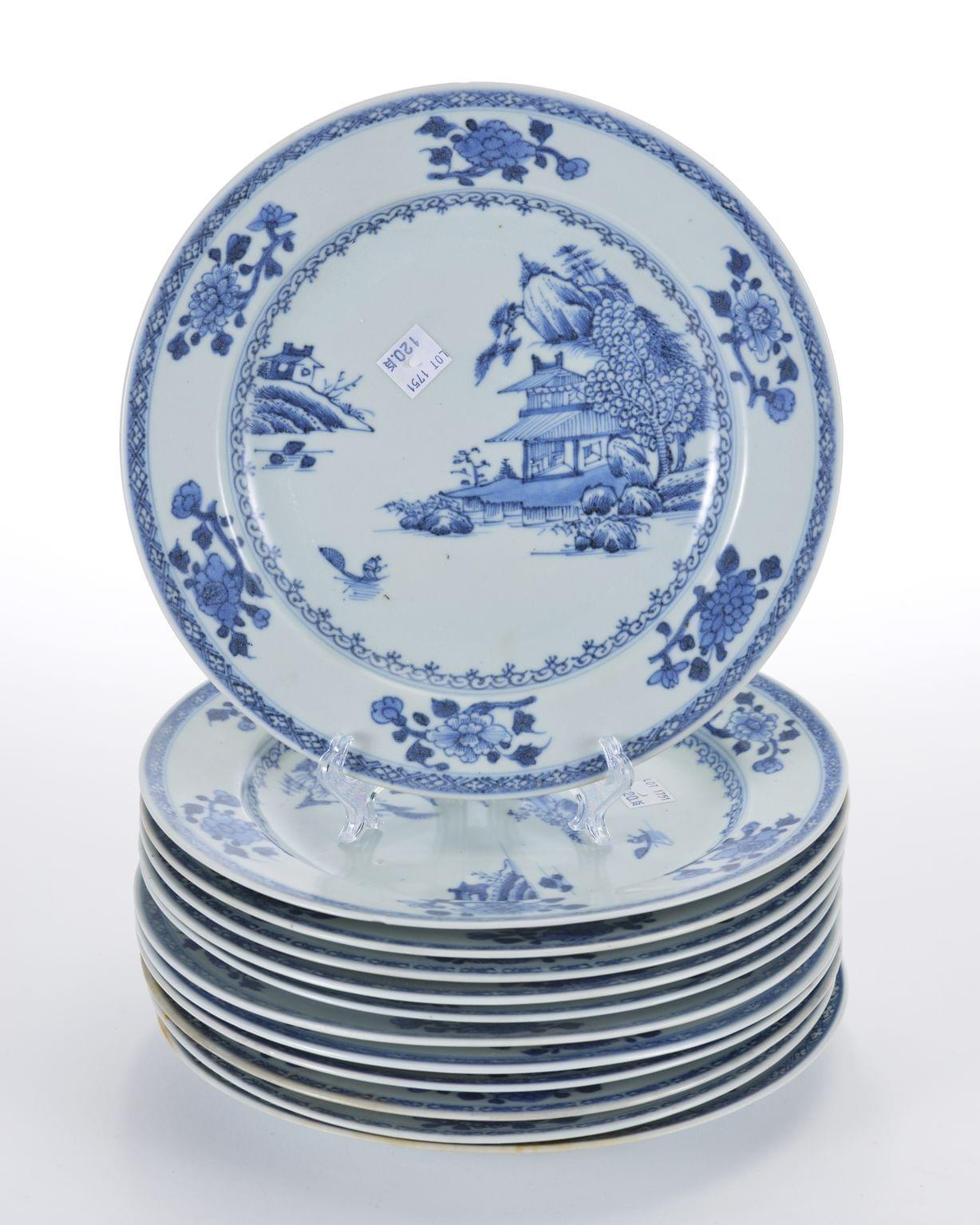 Décor bleu blanc de pavillons sous les pins et batelier sur une rivière, le marli décoré de six fleurs, Chine circa 1750 pour la Compagnie des Indes, porcelaine, D 23. Provenance: Nanking Cargo, Vente Christie's Amsterdam, 28 avril - 2 mai 1986, lot 1751 partiel