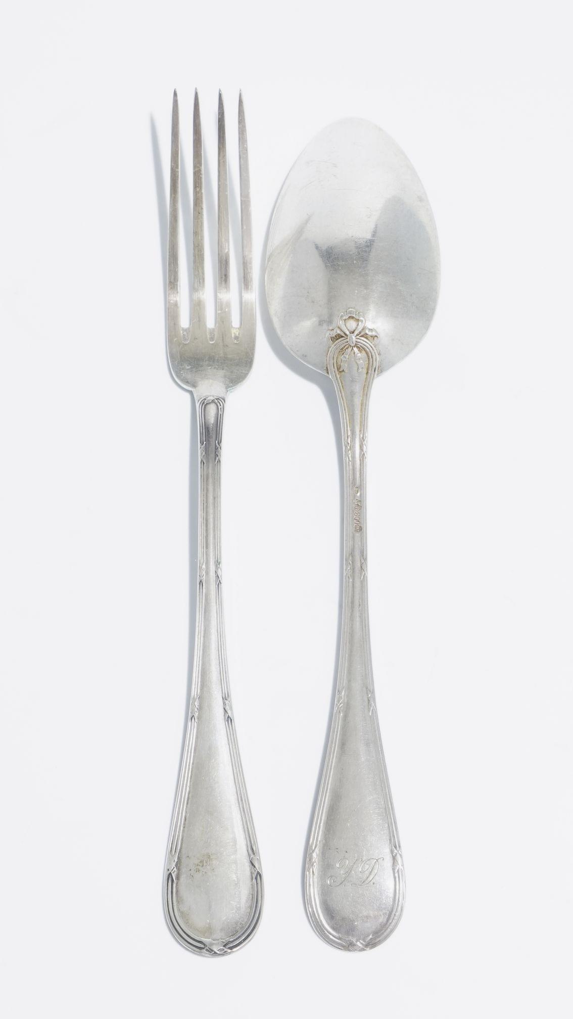 528. Pelle de service ajourée et deux cuillères modernistes à manche...