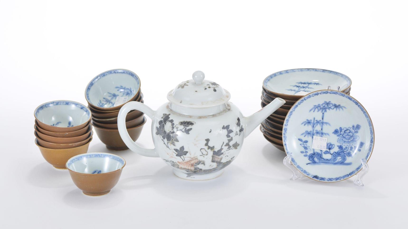 Bols et soucoupes à extérieur dit "batavia brown" café au lait, intérieur à décor blanc bleu de deux tiges de bambou et pivoine, théière boule à décor peint de bambous et pivoine sur une terrasse rocheuse, Chine circa 1750 pour la Compagnie des Indes, porcelaine, D 7,5 et 11,5 cm, L 21,5 cm. Provenance: Nanking Cargo, Vente Christie's Amsterdam, 28 avril - 2 mai 1986, lots 2201 et 5218 partiels