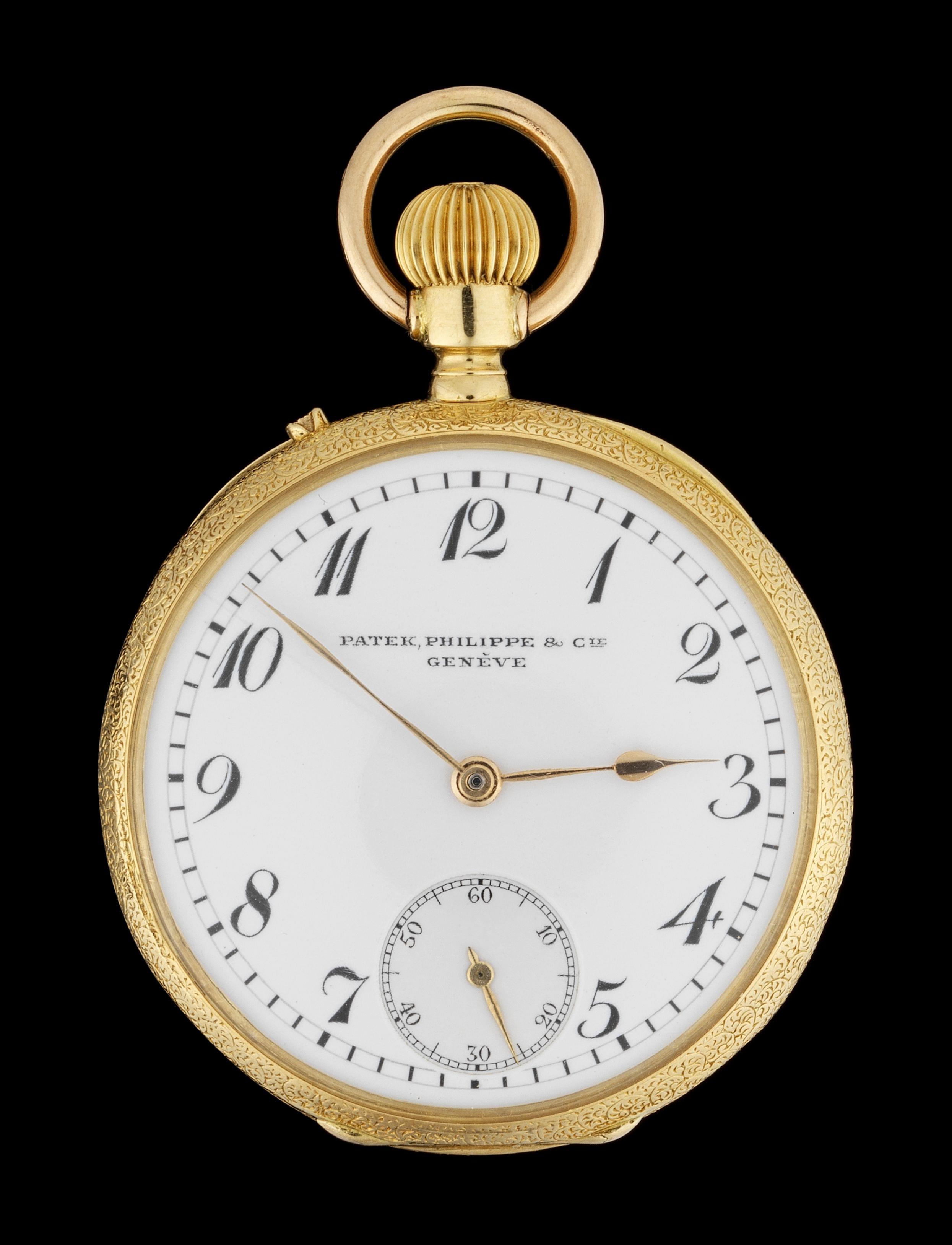 Cadran émaillé blanc, aiguilles dorées, chiffres arabes noirs, secondes à 6h, circa 1920, or 750, D 35 mm, poids brut 37 g