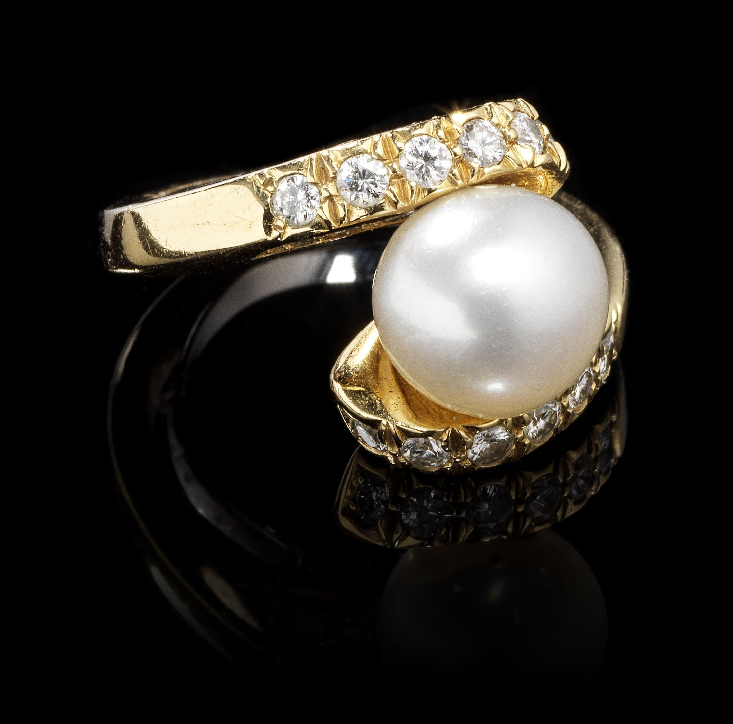 312. Bague sertie d'une perle (D env. 10 mm) rehaussée de lignes de diamants