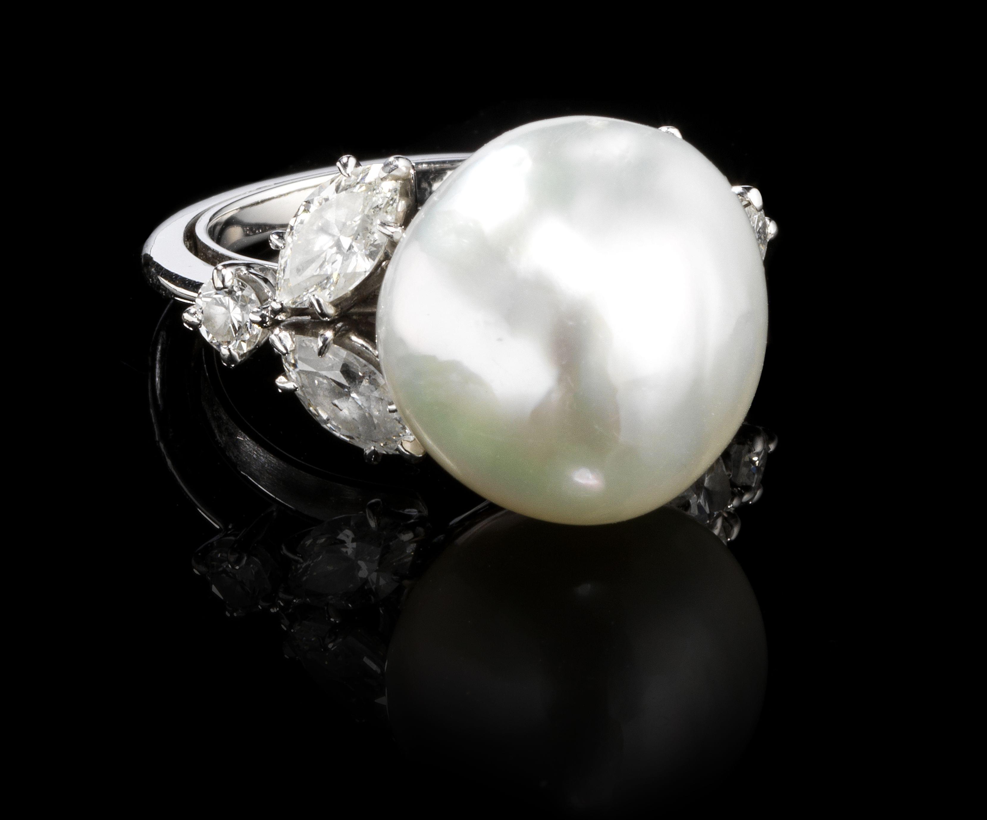304. Bague centrée d'une perle (D env. 8 mm) dans un double entourage...