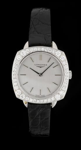 278. Longines, montre carrée mécanique sertie de diamants (env. 0,9 c...