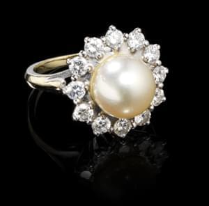 305. Bague centrée d'une perle (D env. 9 mm) entourée de diamants (en...