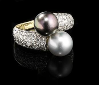 Sertie d'une perle grise (D env. 8,9 mm) et d'une perle de Tahit...