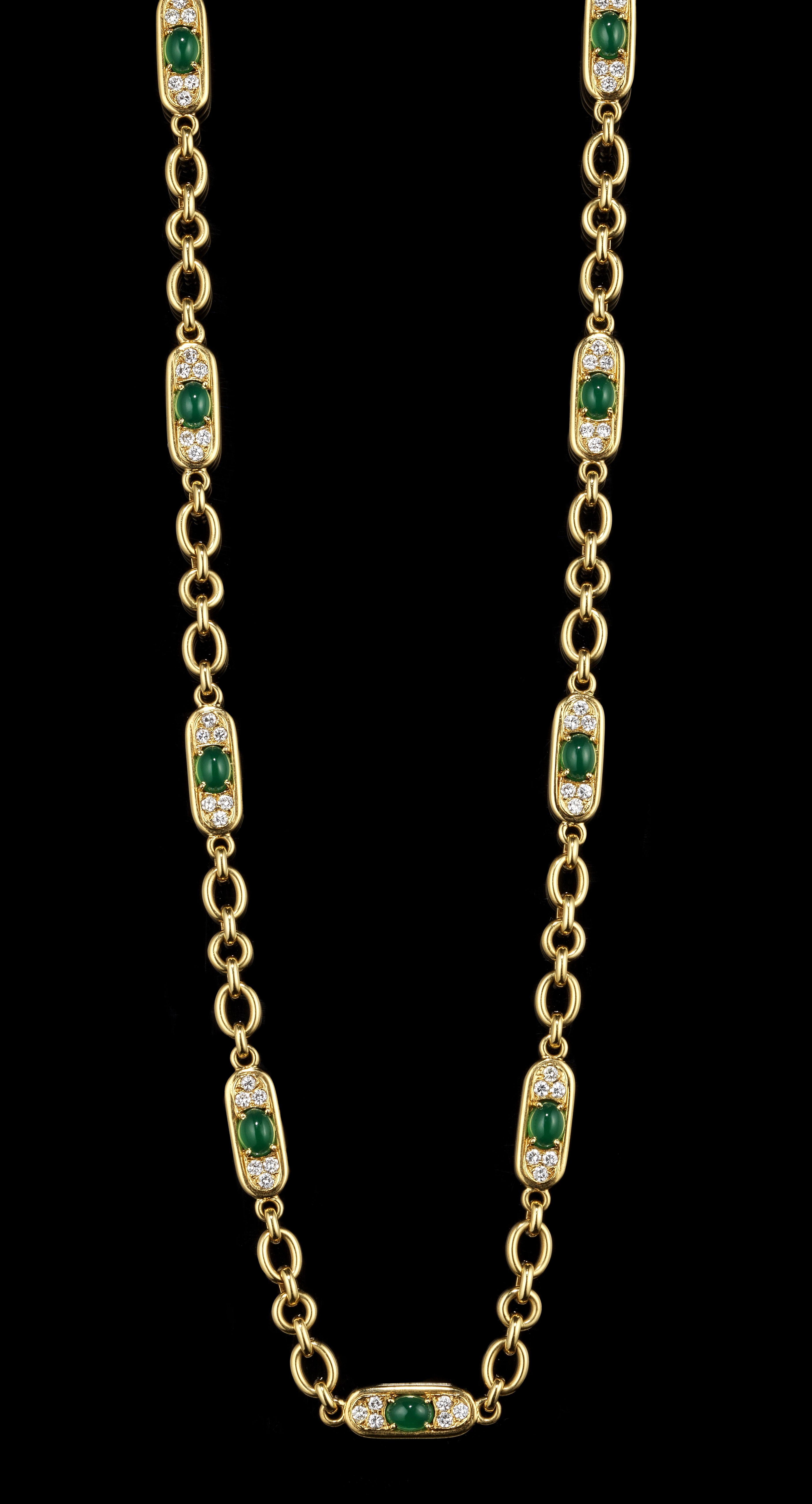 348. Van Cleef and Arpels, sautoir composé de motifs centrés d'agates vertes taille cabochon ovales épaulées de diamants (total env. 5 ct)