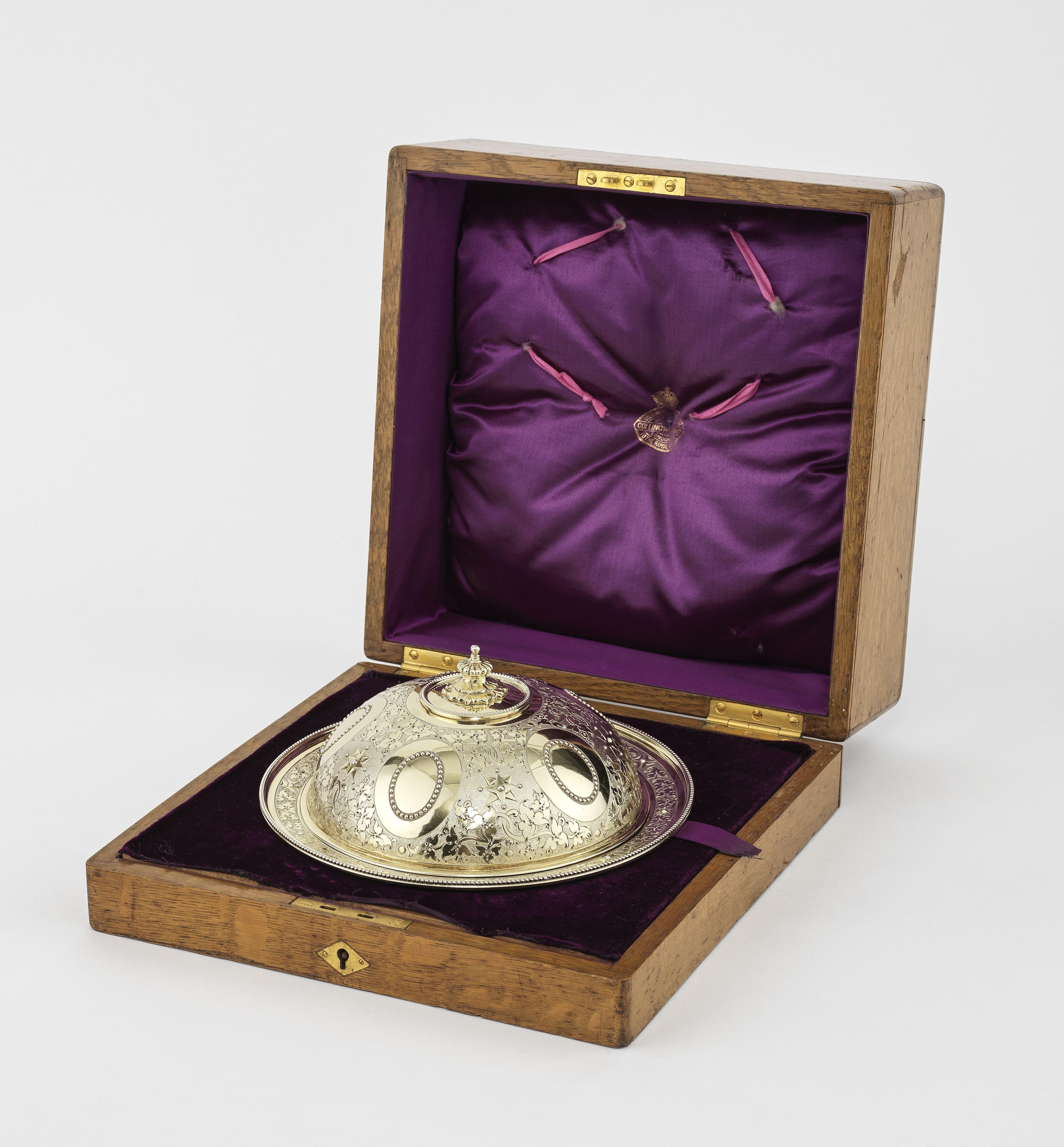 George Fox, Londres, 1884, vermeil, coffret et bois naturel de la maison Collingwood & Co, D 18 cm, 510 g