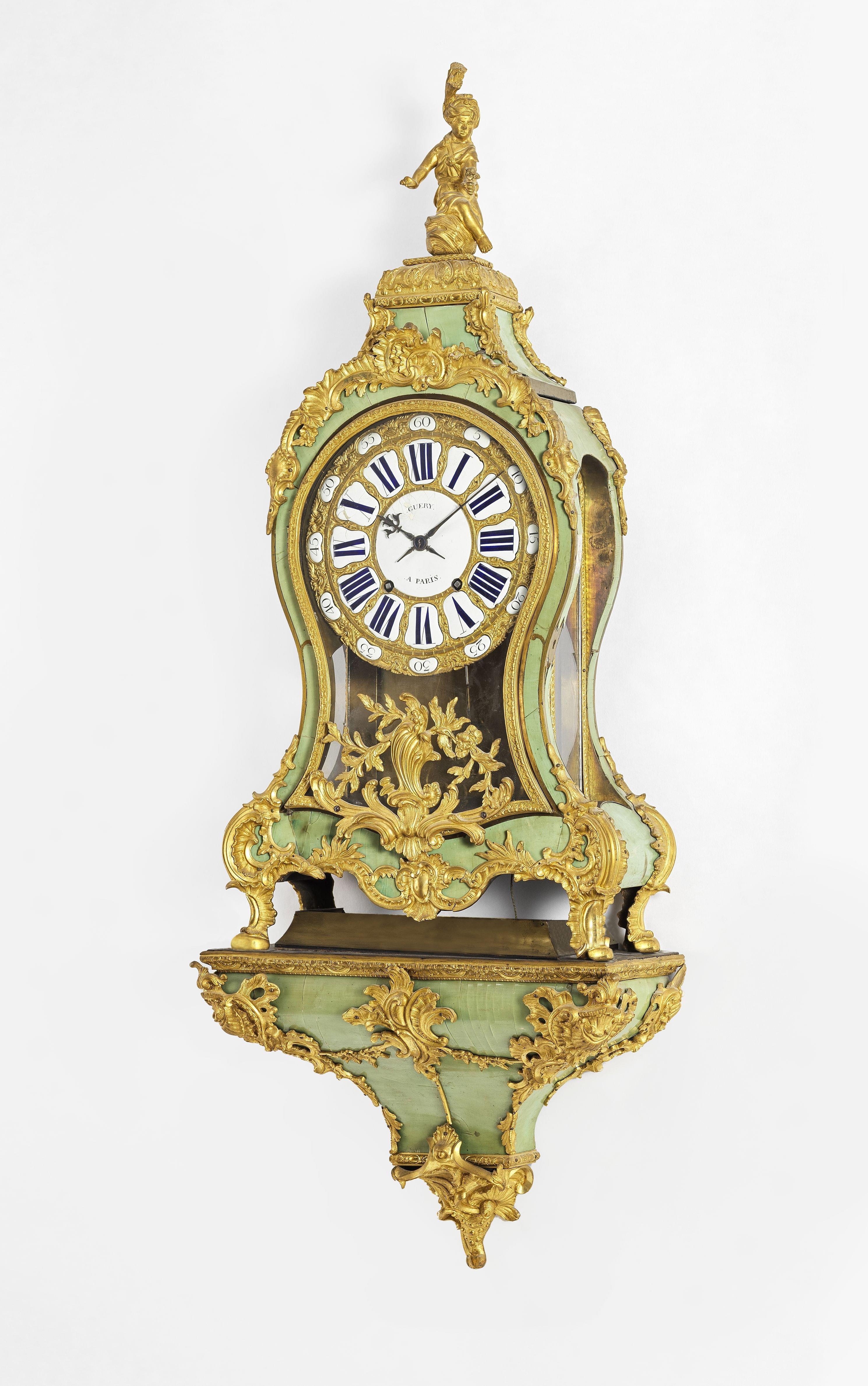 215. Cartel et sa console d'époque Louis XV, cadran et mouvement signé Guéry à Paris
