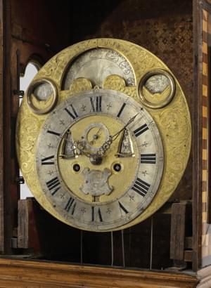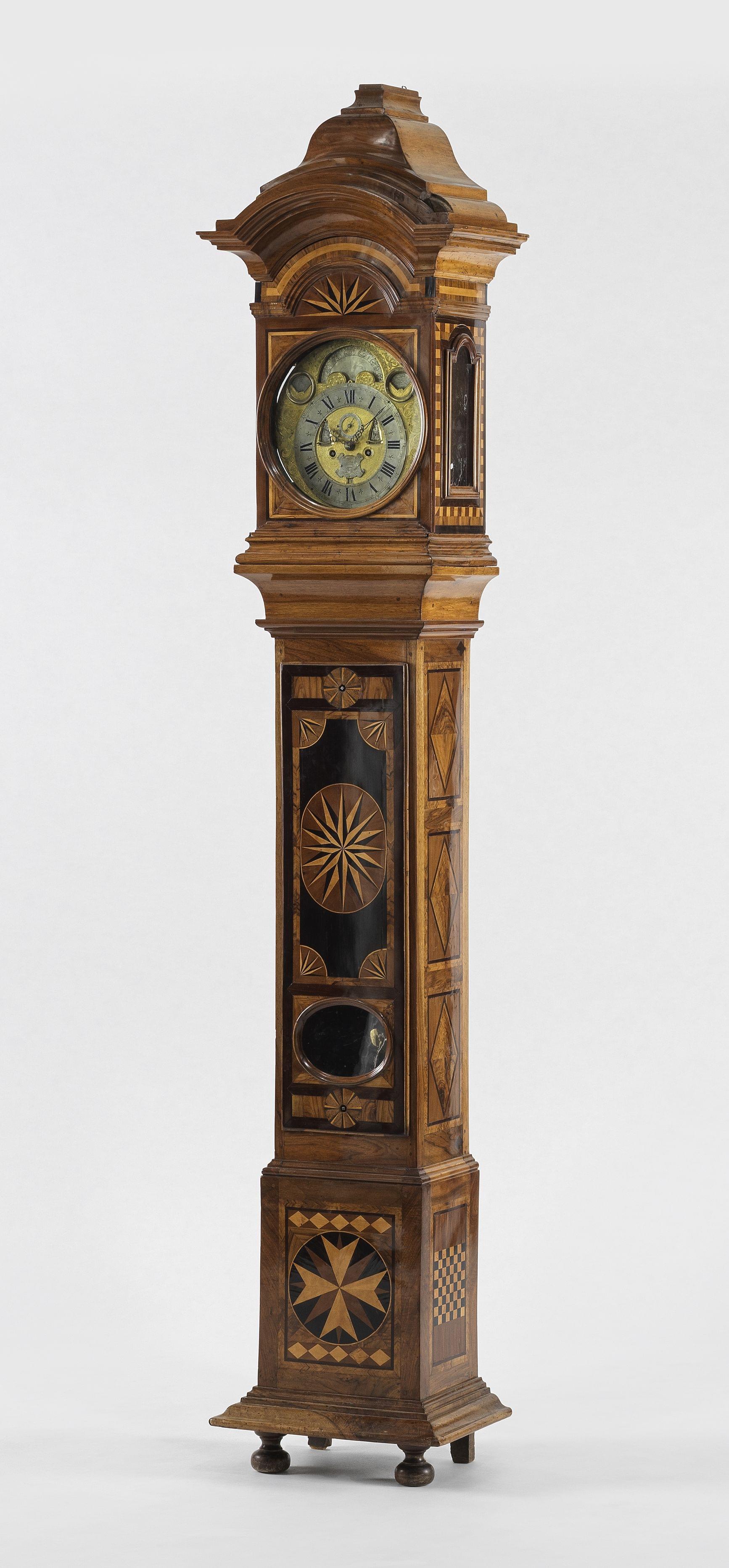 Cadran en étain et laiton richement ciselé, indiquant les secondes, les minutes, les heures, les moments de la journée, les jours de la semaine, les mois, les phases de la Lune, les jours du mois, les signes du Zodiaque et les saisons, orné d'armoiries, caisse en marqueterie de bois fruitier à motif de croix de Malte et rosaces dans des encadrements de filets, H 241 cm
