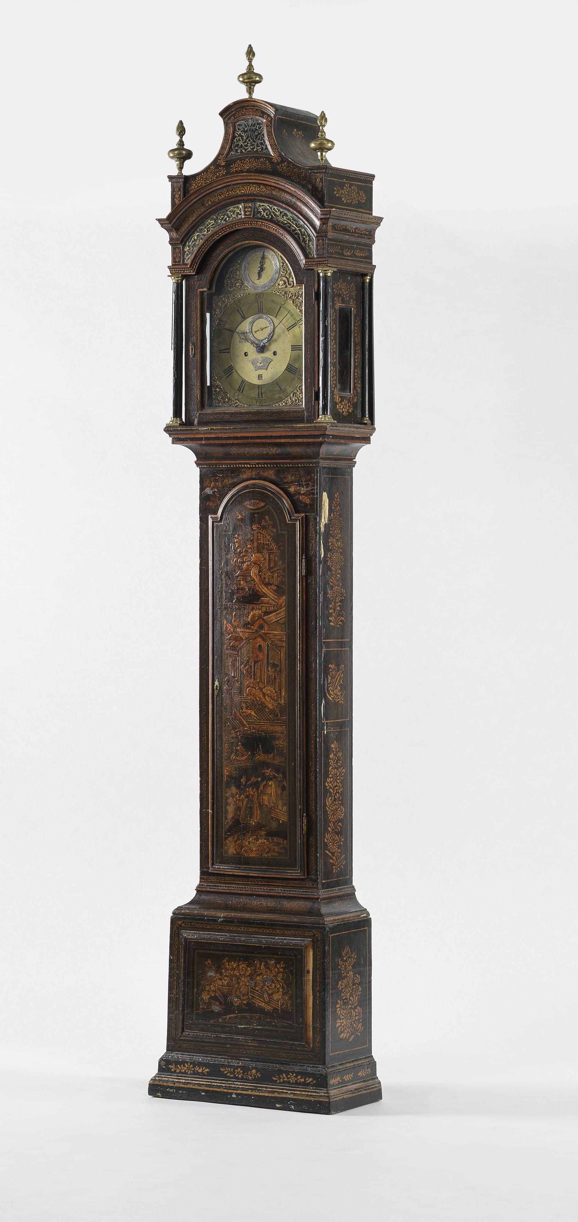 Cadran en laiton signé Charles Cabrier, London, caisse en bois laqué noir et or à motif au chinois, H 270 cm