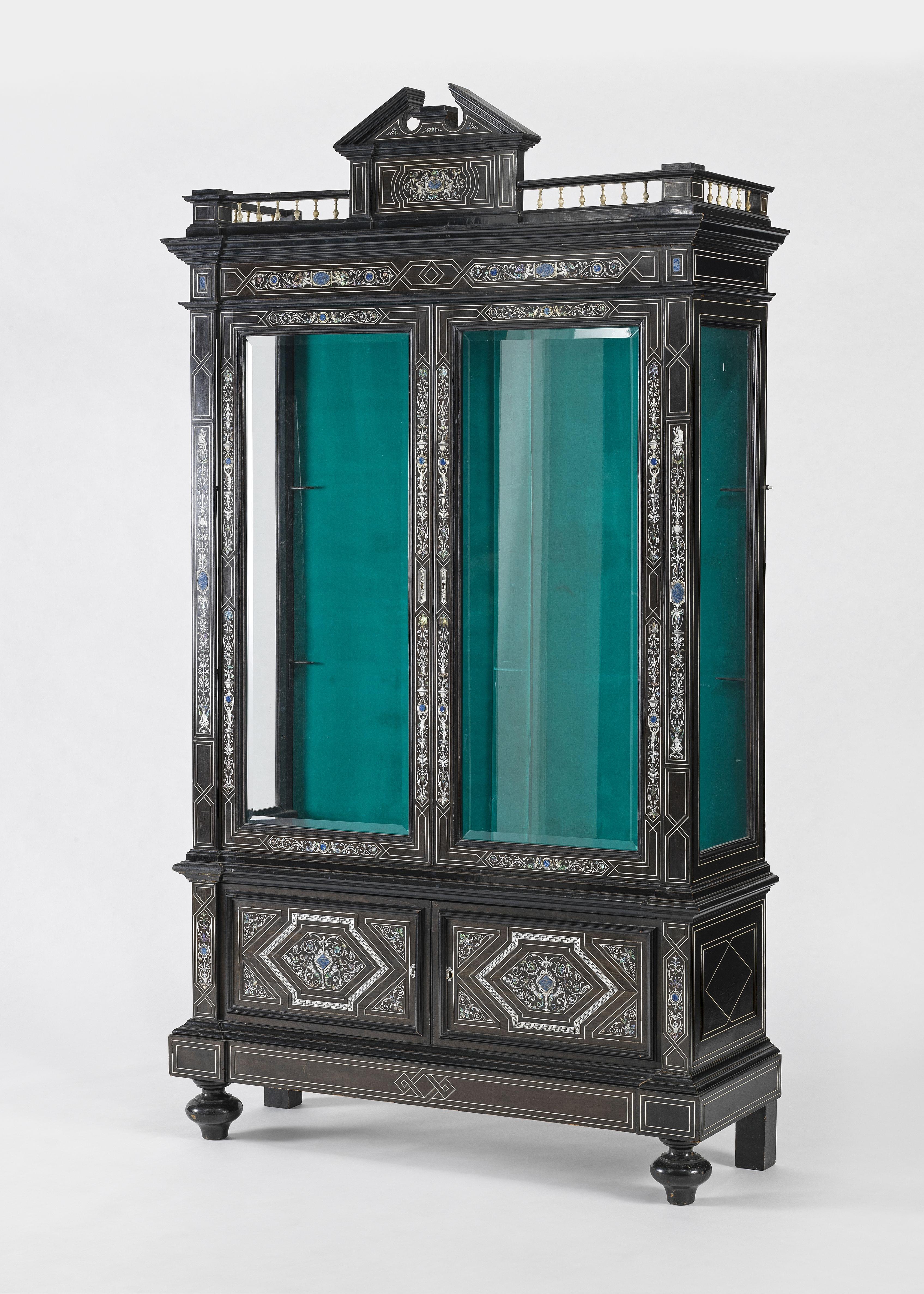 Bois noirci à décor marqueté d'ivoire, nacre et lapis lazuli, 225x124x42 cm