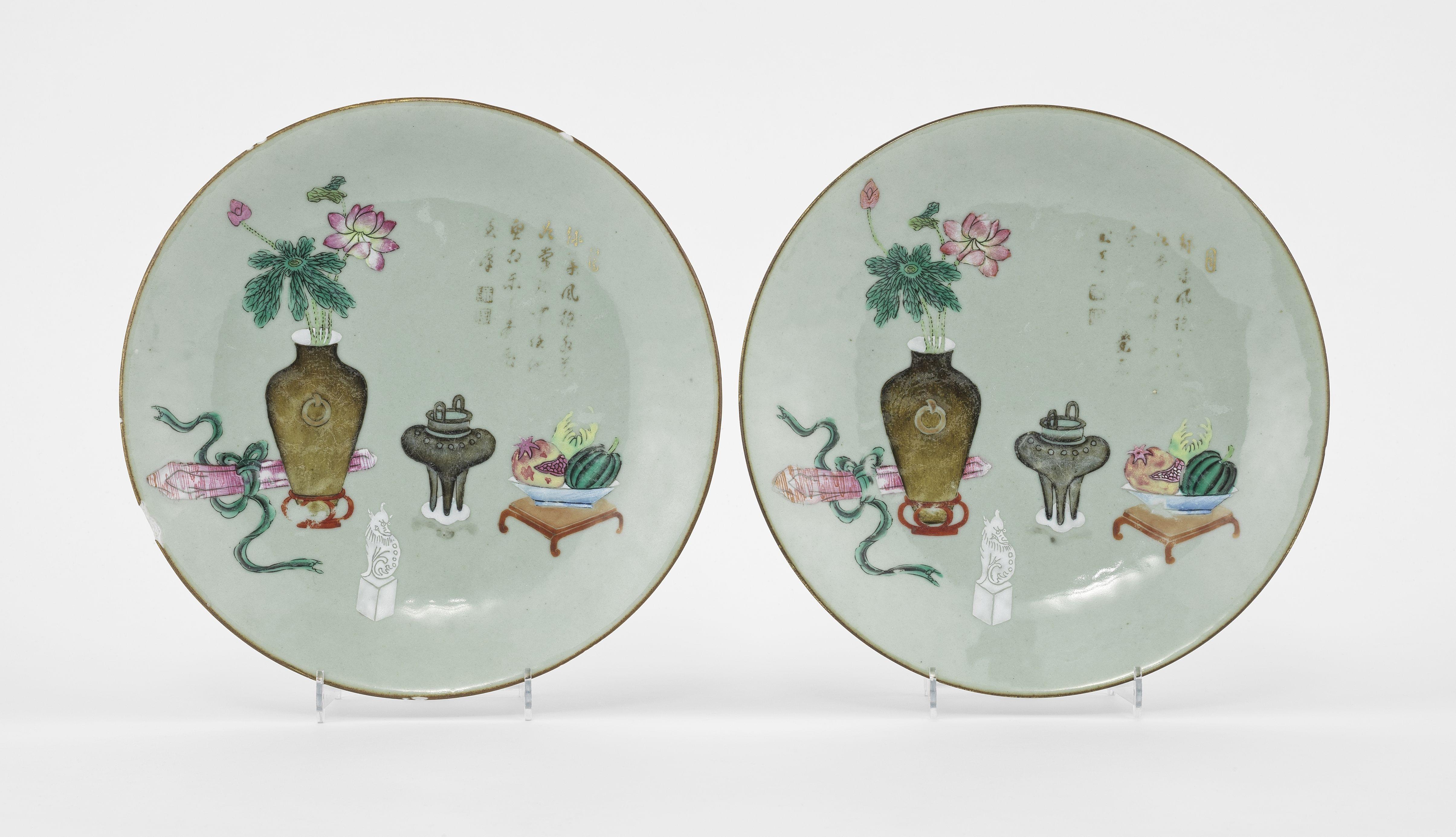 Porcelaine à motifs d'ustensiles sur fond céladon, D 24 cm