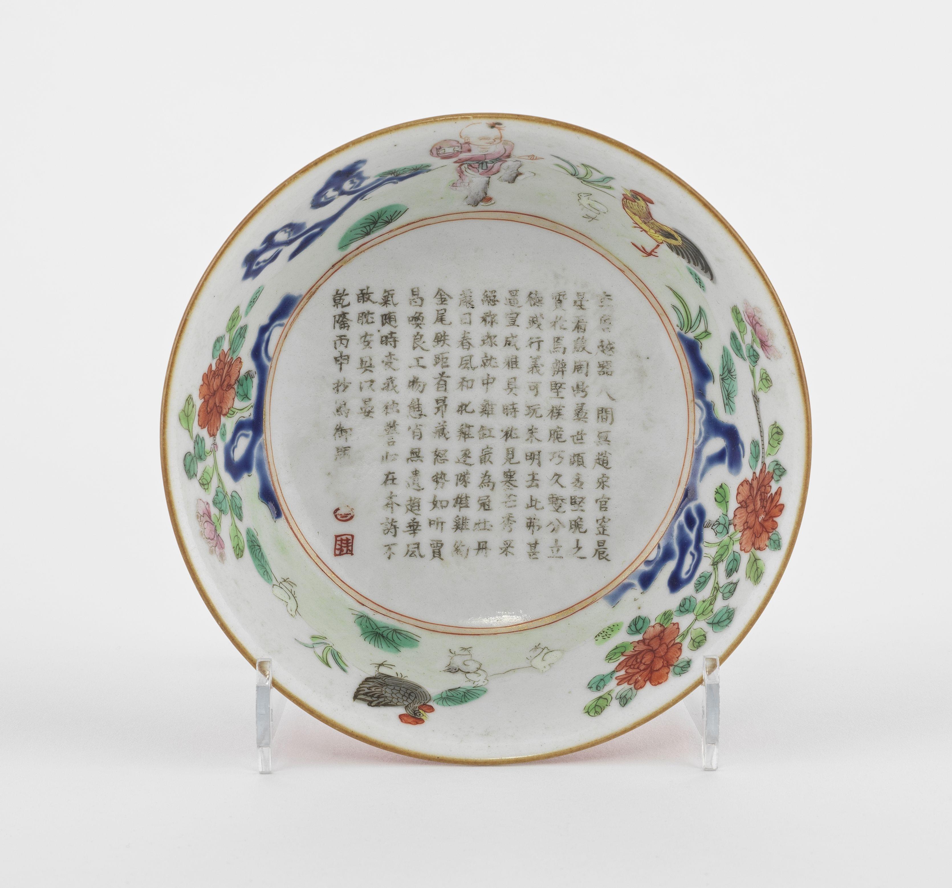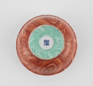 Porcelaine émaillée polychrome à motif d'un poème de l'empereur Qianlong daté de 1776, l'extérieur émaillé façon faux bois, D 11.5 cm