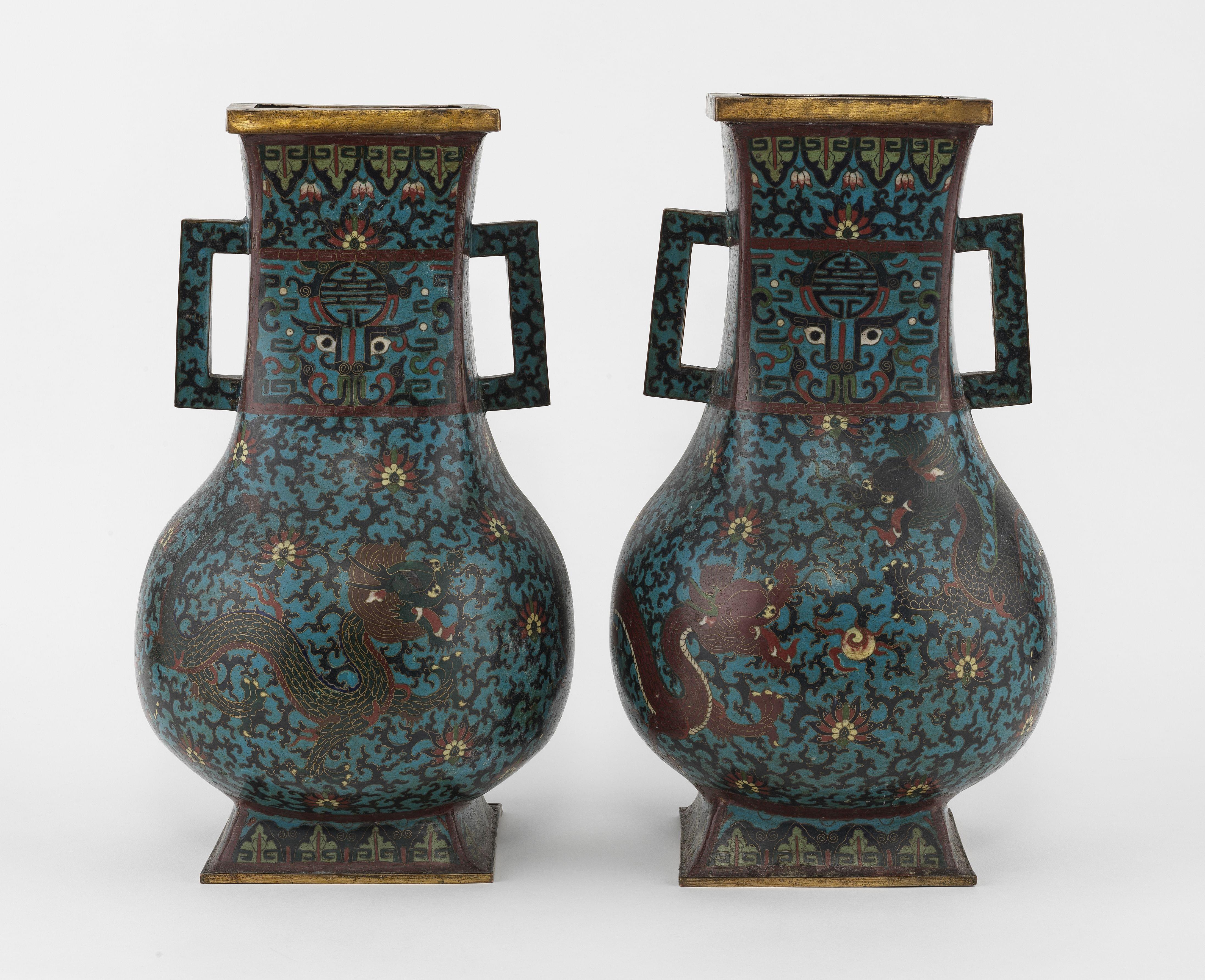 Cuivre et émaux polychromes à décor de deux dragons poursuivant la perle sacrée sur fond bleu, H 45 cm