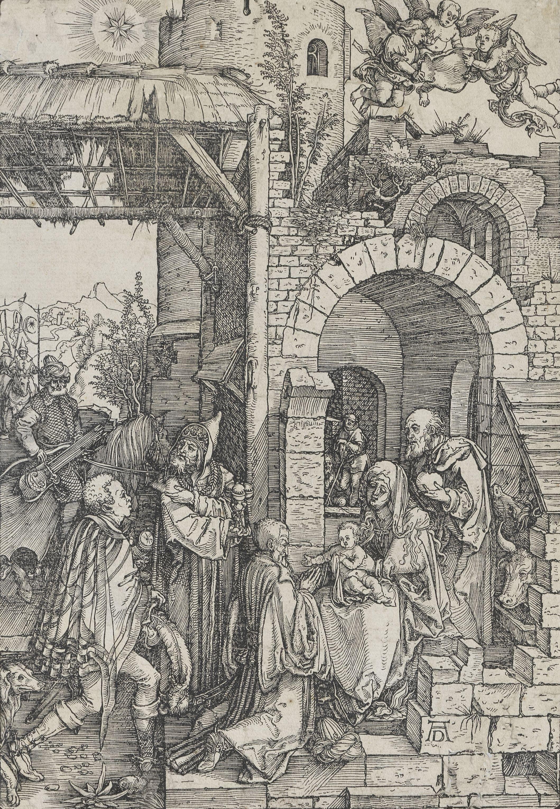 L' Adoration des mages. Planche de la série La Vie de la Vierge, bois, 29,7x20,7cm. Belle épreuve du tirage de 1511 avec le texte au verso, coupée sur le trait d'encadrement. Quelques traces de plis cassés, accidents dans l'angle inférieur droit et les bords, petites amincissures. Sur papier au filigrane « Tour couronnée ». Rognée d'environ 2mm sur les bords droit et gauche. (Hollstein 199, Bartsch 87).