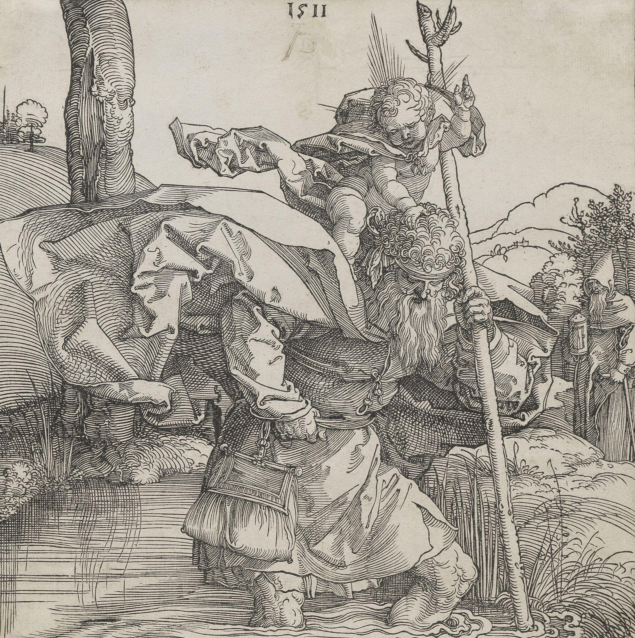 Saint Christophe, bois, 21x21cm.Très belle épreuve coupée sur le trait d'encadrement, très légèrement tardive. Quelques anciennes traces de plis redressées, ayant été lavées. Trace du monogramme AD à l'encre brune au recto sous la date, petite amincissure dans le bord supérieur au verso. (Hollstein 223, Bartsch 103)