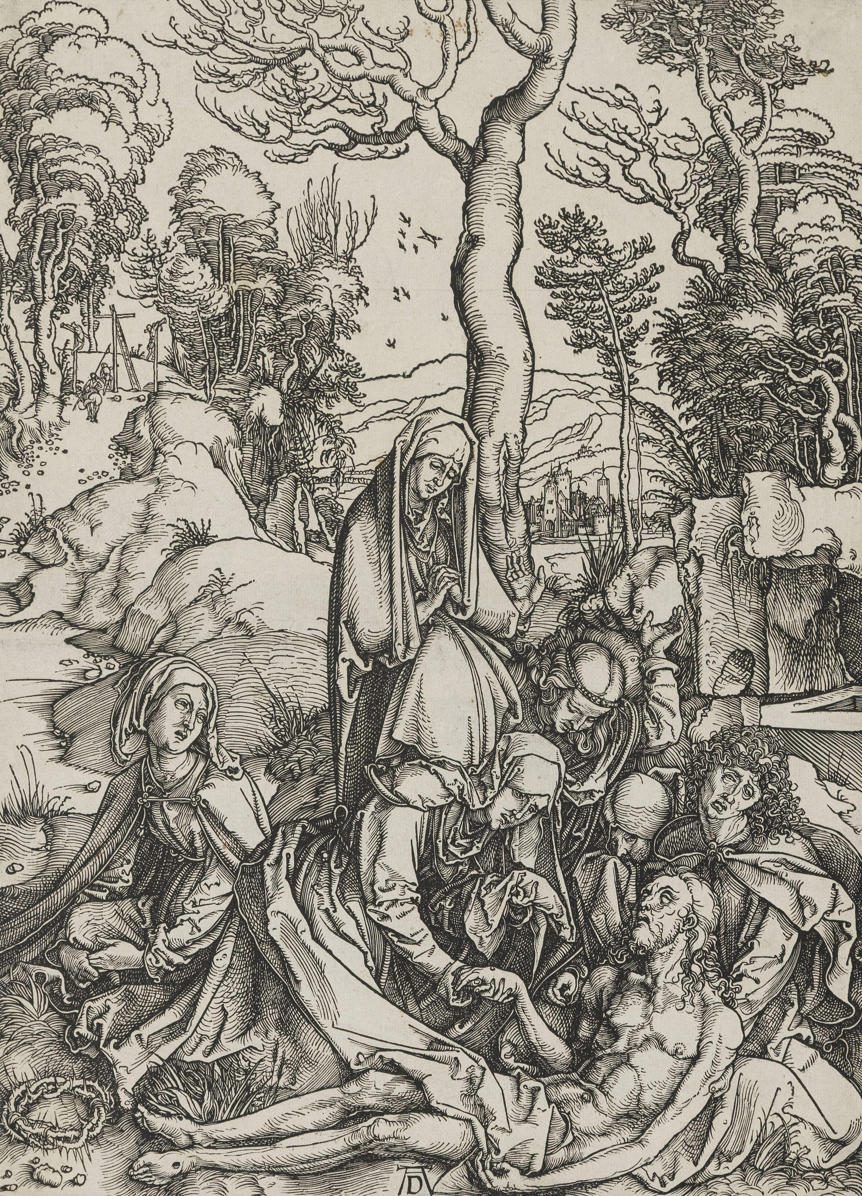 La Lamentation. Planche de la série La Grande Passion, bois, 38,8x28,2 cm. Très belle épreuve avant le texte latin au verso, papier avec filigrane Orbe (W...). Ancienne pliure horizontale médiane, petites taches. Sans marges. (Hollstein 122, Bartsch 13).
