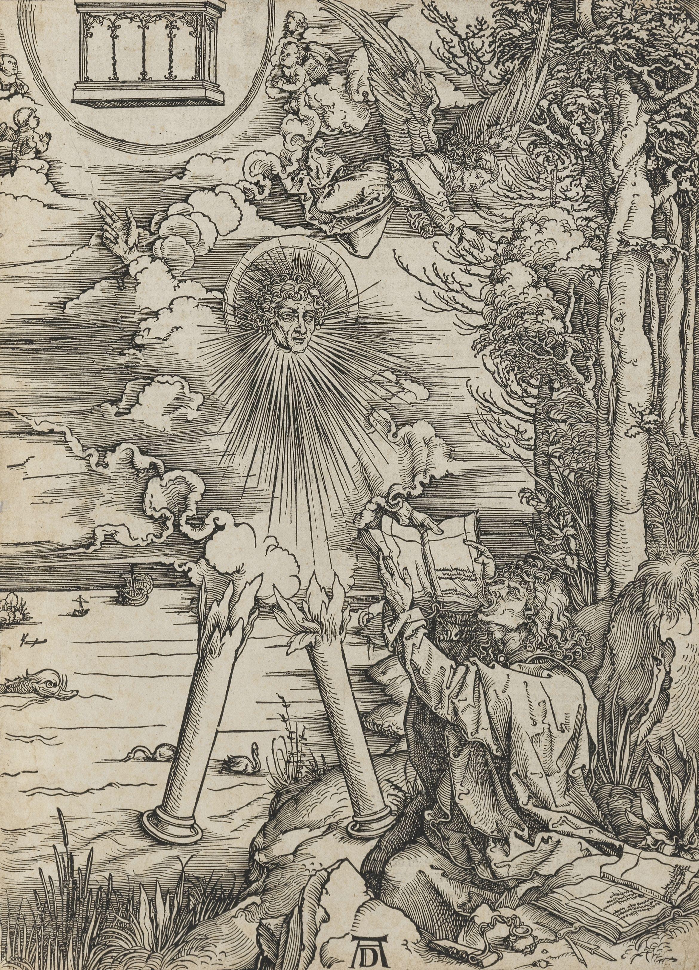 Saint Jean dévorant le livre. Planche de la série L'Apocalypse, bois, 39,1x28,1cm. Très belle épreuve de l'édition de 1511 avec le texte latin au verso sur papier au filigrane d'une tour couronnée. Légèrement jaunie, petits manques et accidents, amincissure sur une bande le long du bord gauche. Mention de l'ancienne collection G.Storck, négociant à Milan (Lugt 2318). (Hollstein 172, Bartsch 70)