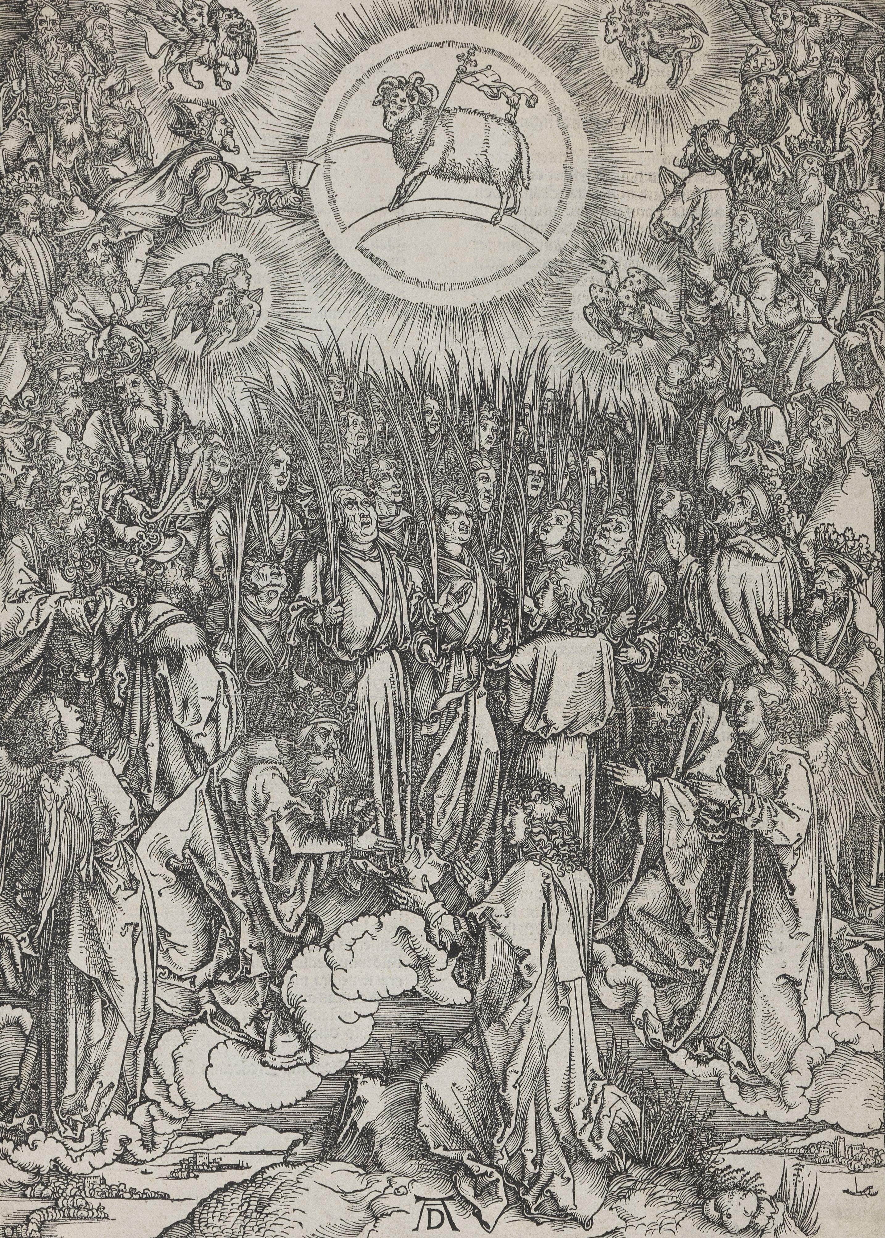 L' Adoration de l'agneau. Planche de la série l'Apocalypse, bois, 39,2x28cm.Très belle épreuve de l'édition de 1511 avec le texte latin au verso. Quelques petits accidents dans les bords. Filets de marge. (Hollstein 176, Bartsch 67).