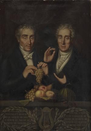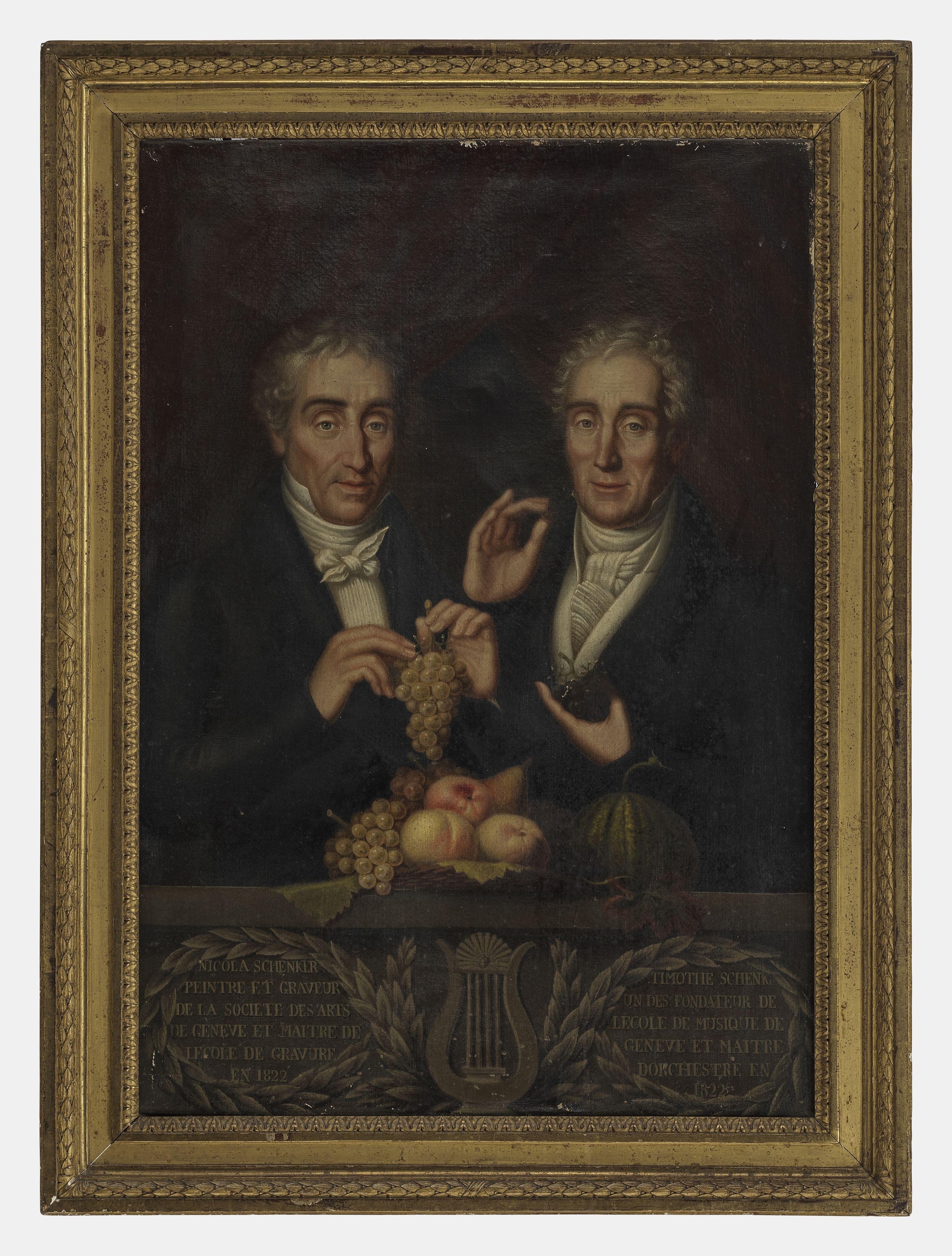 Portrait des frères Schenker, huile sur toile, 110x75 cm. Nicola Schenker peintre et graveur de la société des arts de Genève et maître de l'école de gravure en 1822 et Timothé Schenker, un des fondateurs de l'école de Musique de Genève et maître d'orchestre en 1822.