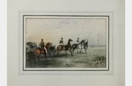 Calèche à quatre chevaux, aquarelle, signée et datée 1853, 19x30...