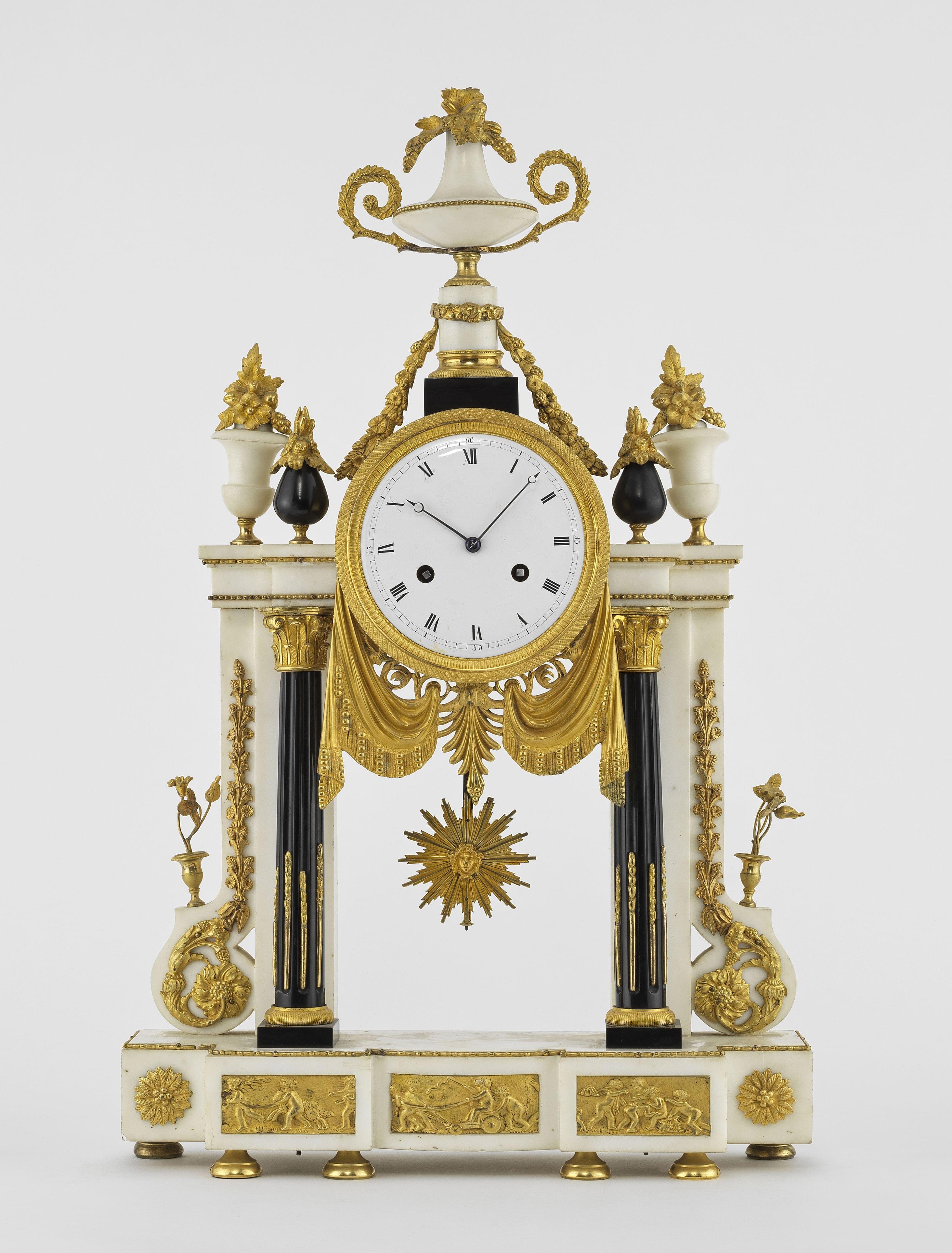 Marbre blanc et noir, bronze doré, cadran émaillé blanc, H 65 cm