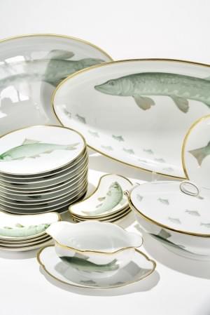3225. Service à décor de différents poissons en camaïeu vert et filet...