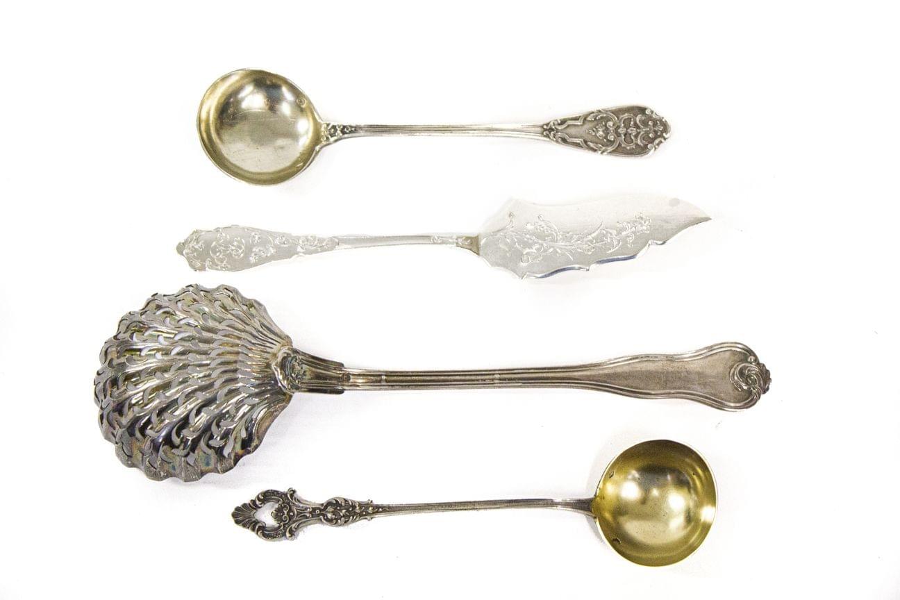 3386. 2 cuillères à crème, 1 à saupoudrer et 1 pelle à miniardises de style Rocaille