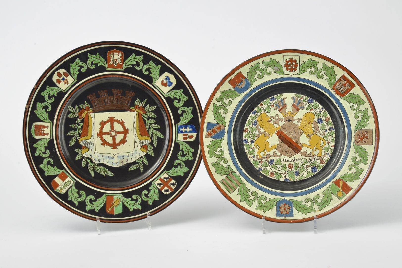 Terre vernissée à décor central aux armoiries de deux villes de l'Est de la France, fond brun, non signées, D 36 cm.