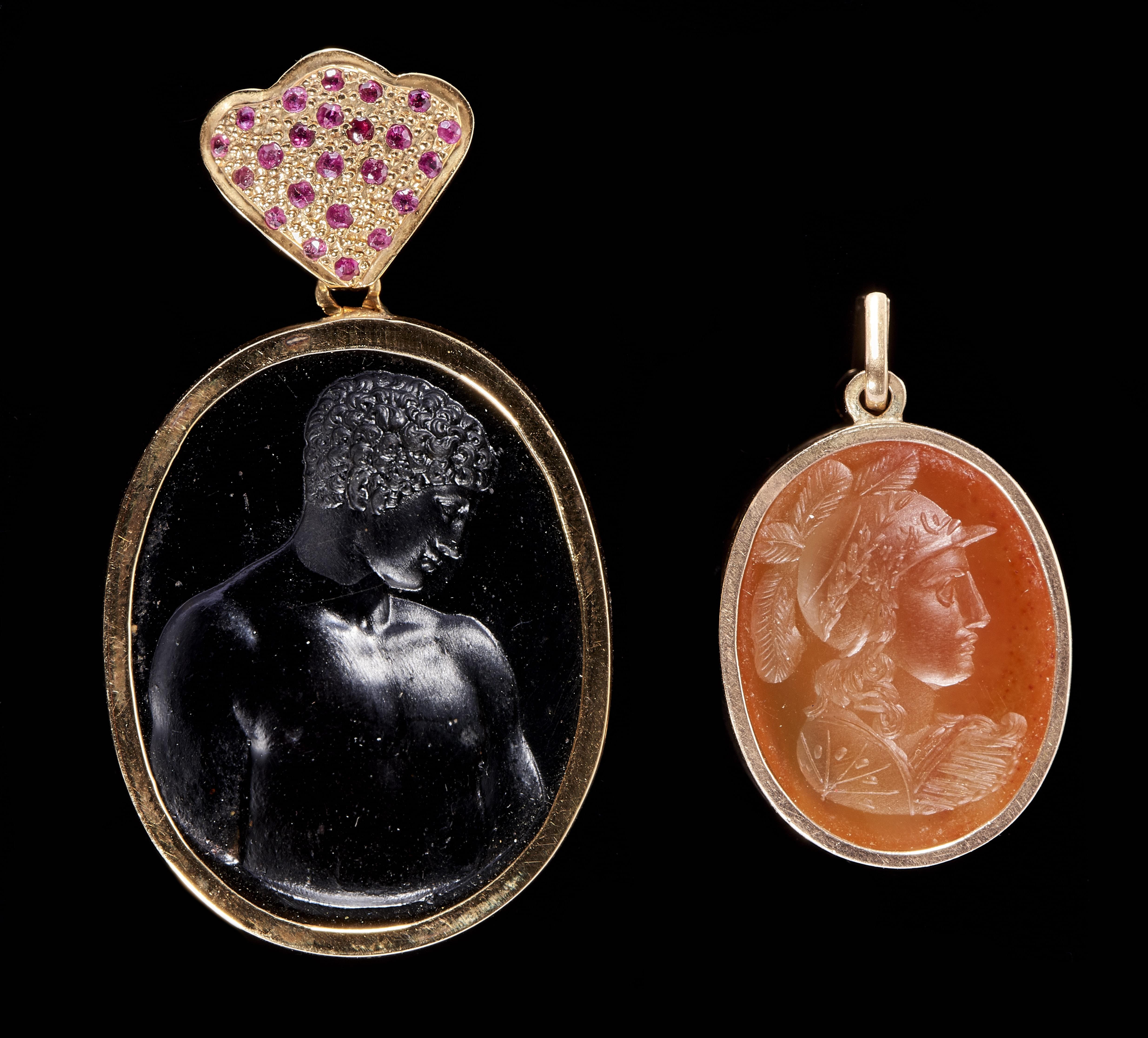 L'une à décor d'Antinous sur verre rehaussé de rubis, l'autre d'Athéna sur agate, or jaune 750 et 585, H 2,7 et 4 cm