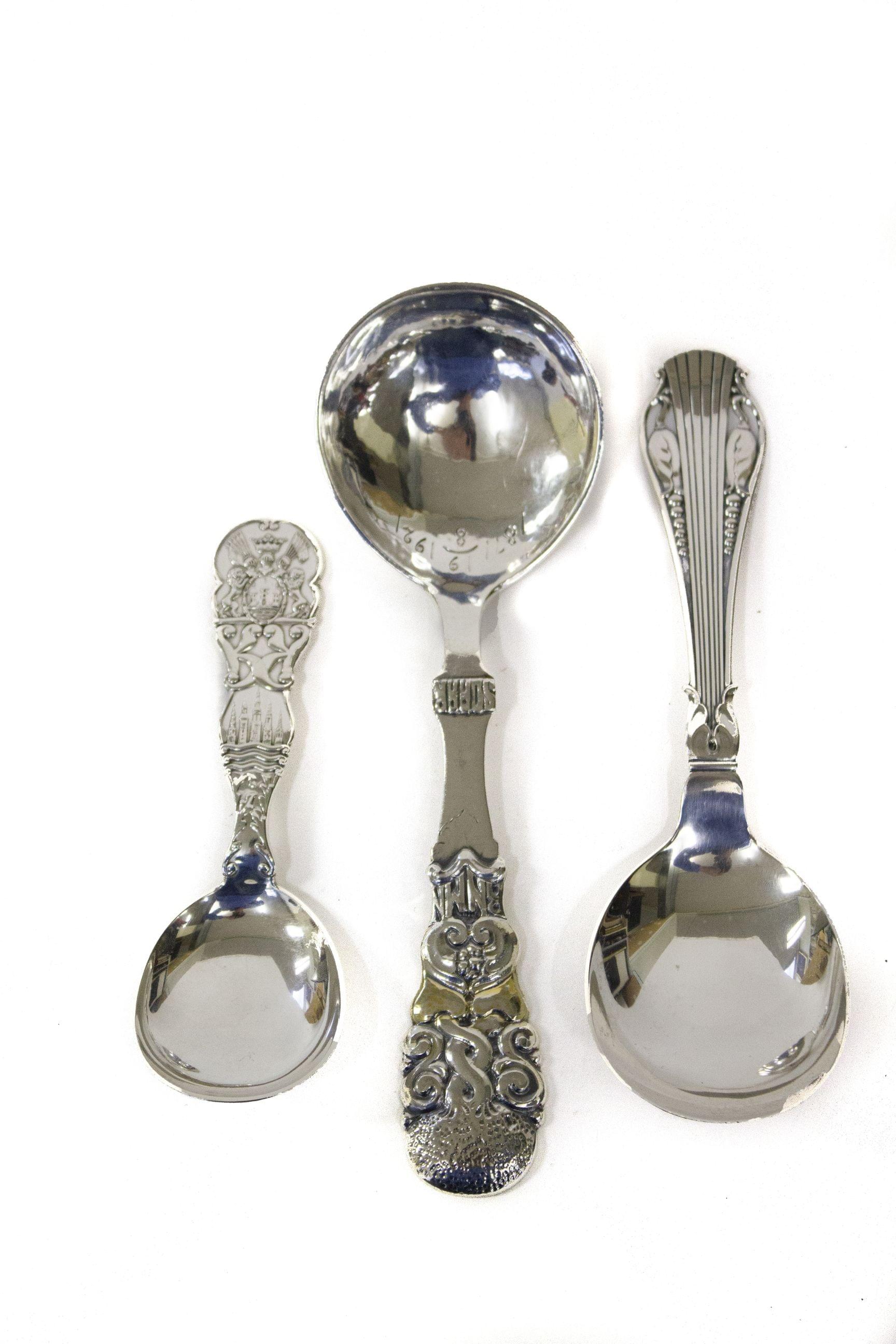 3581. 3 cuillères, une à décor des armes de Copenhague, à motif d'arbres enlacés et un autre à décor végétal stylisé