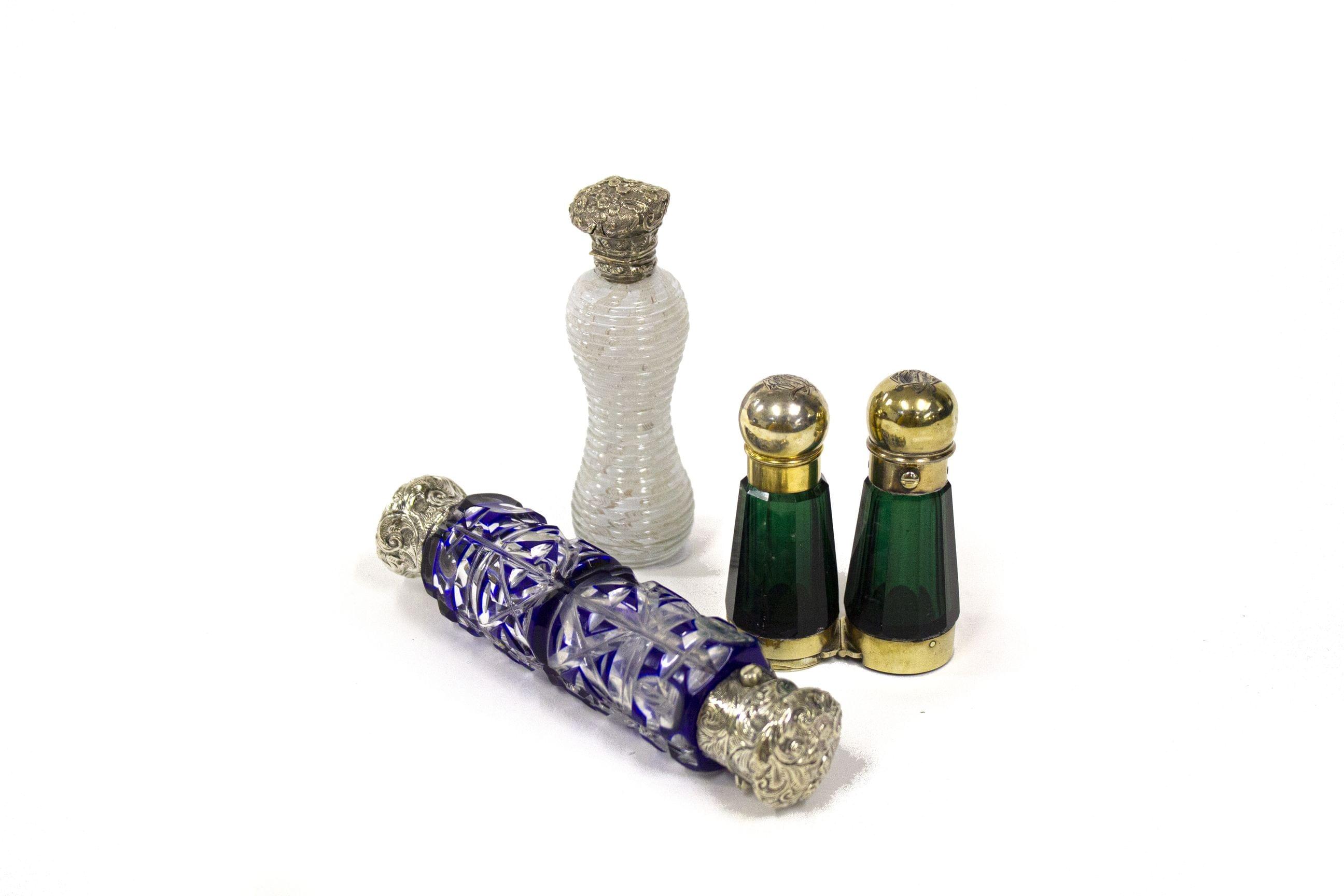 Opaline blanche et rose, verre incolore et bleu, l'un orné du po...