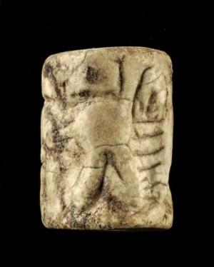 (1) Un personnage aux bras levés, une hutte et un scorpion (2) Deux registres l'un de scorpions, l'autre de poissons, (3) Une procession de personnages tenant un bâton, 20x15 mm, 18x10 mm, 18x18 mm