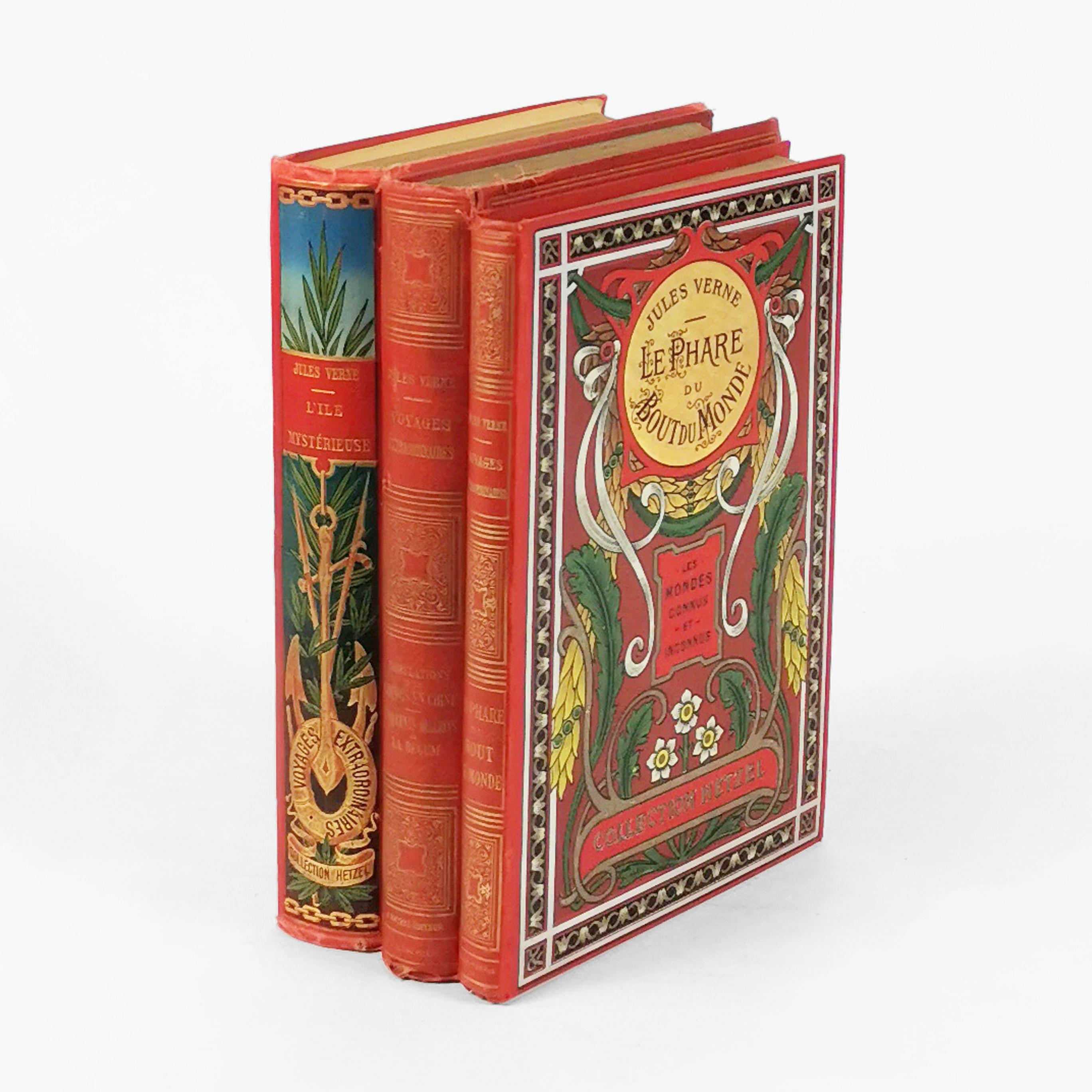 - L’Ile Mystérieuse. Percaline polychrome, dos à l’ancre, plat à la mappemonde. En fin de volume, catalogue de la Maison Hetzel H F. Bon état.- Tribulations d’un Chinois en Chine. Cins cents Millions de la Begum. Percaline rouge, plats aux deux éléphants. En fin de volume, catalogue de la Maison Hetzel A B. Bon état.- Le Phare du But du Monde. Percaline polychrome, vers 1920.