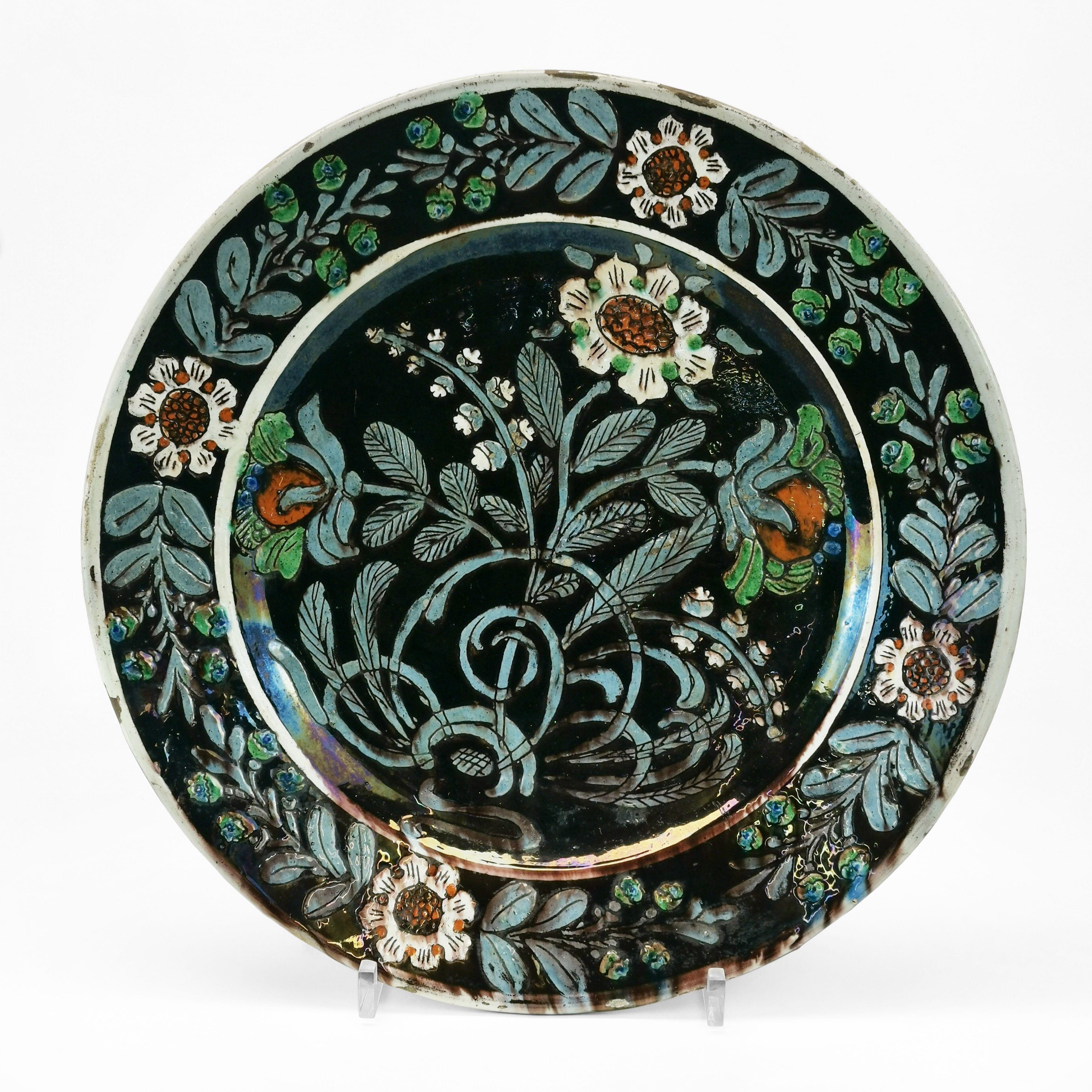 Faïence émaillée polychrome à motif floral, D 36 cm