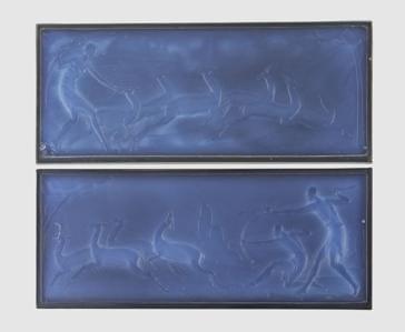 Deux plaques à décor en bas-relief de scènes de chasse, verre mo...