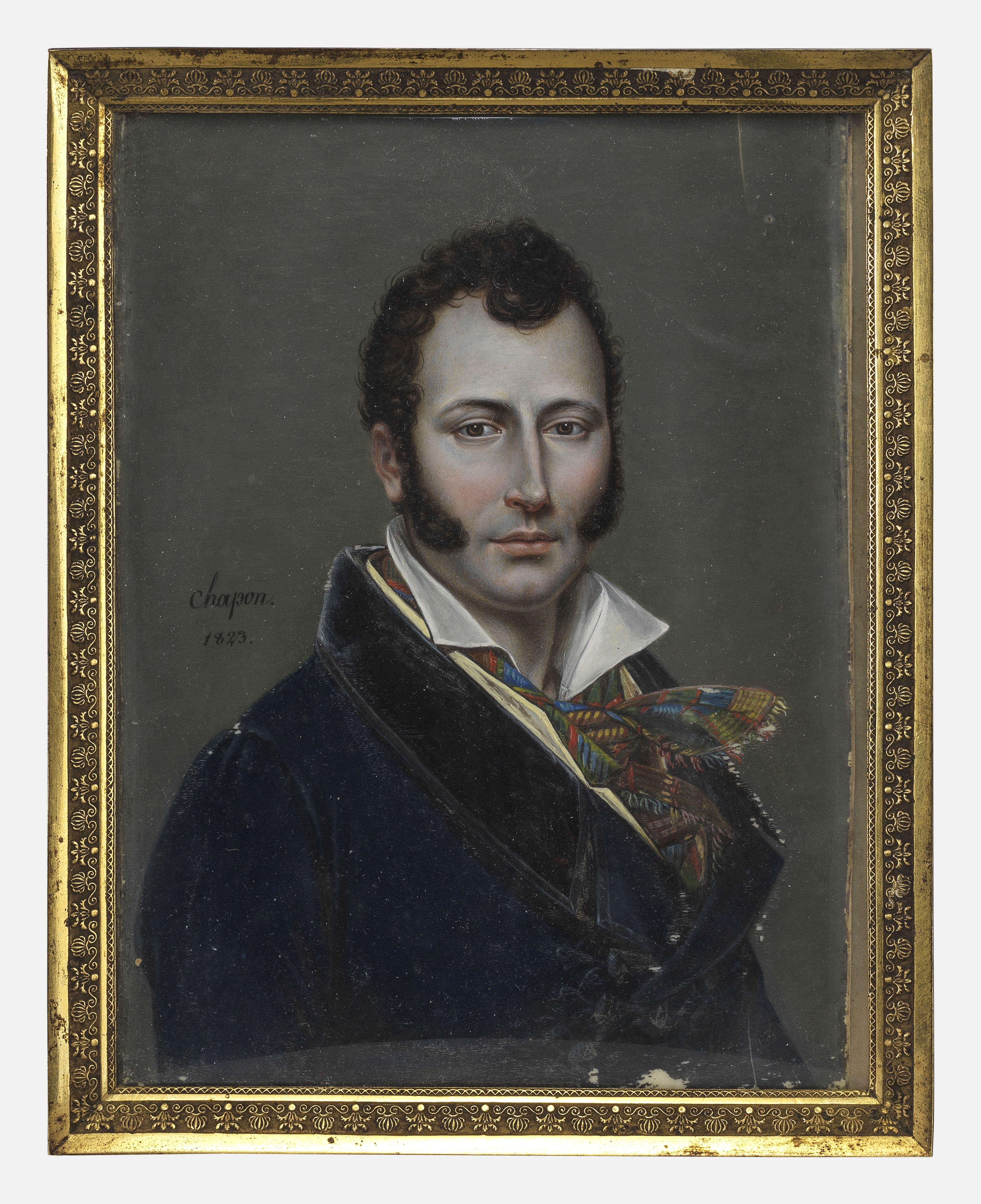 Portrait d'un gentilhomme, miniature signée Chapon et datée 1823, 16x11 cm