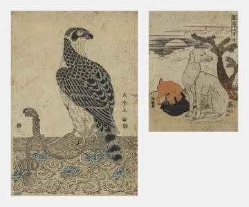 Faucon et chien, deux estampes, 25x18 et 38x25 cm. Provenance: c...