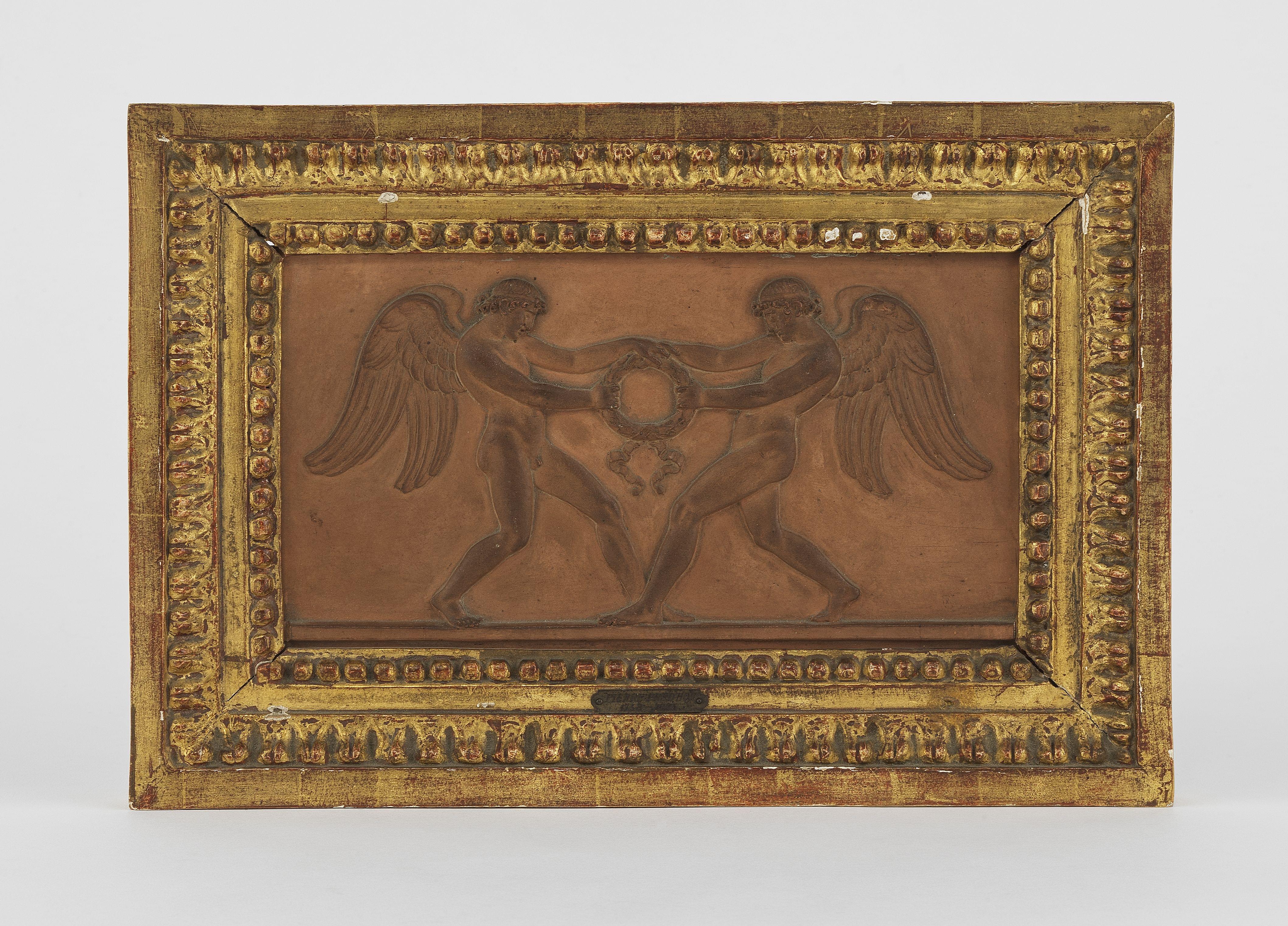 Bas-relief aux victoires se disputant une couronne, terre cuite, signée à la pointe au dos Prud'hon et daté 1799, étiquette de l'expert Rehfous avec note manuscrite indiquant que cette terre cuite a été donnée par Prud'hon à son amie, 10x20 cm.