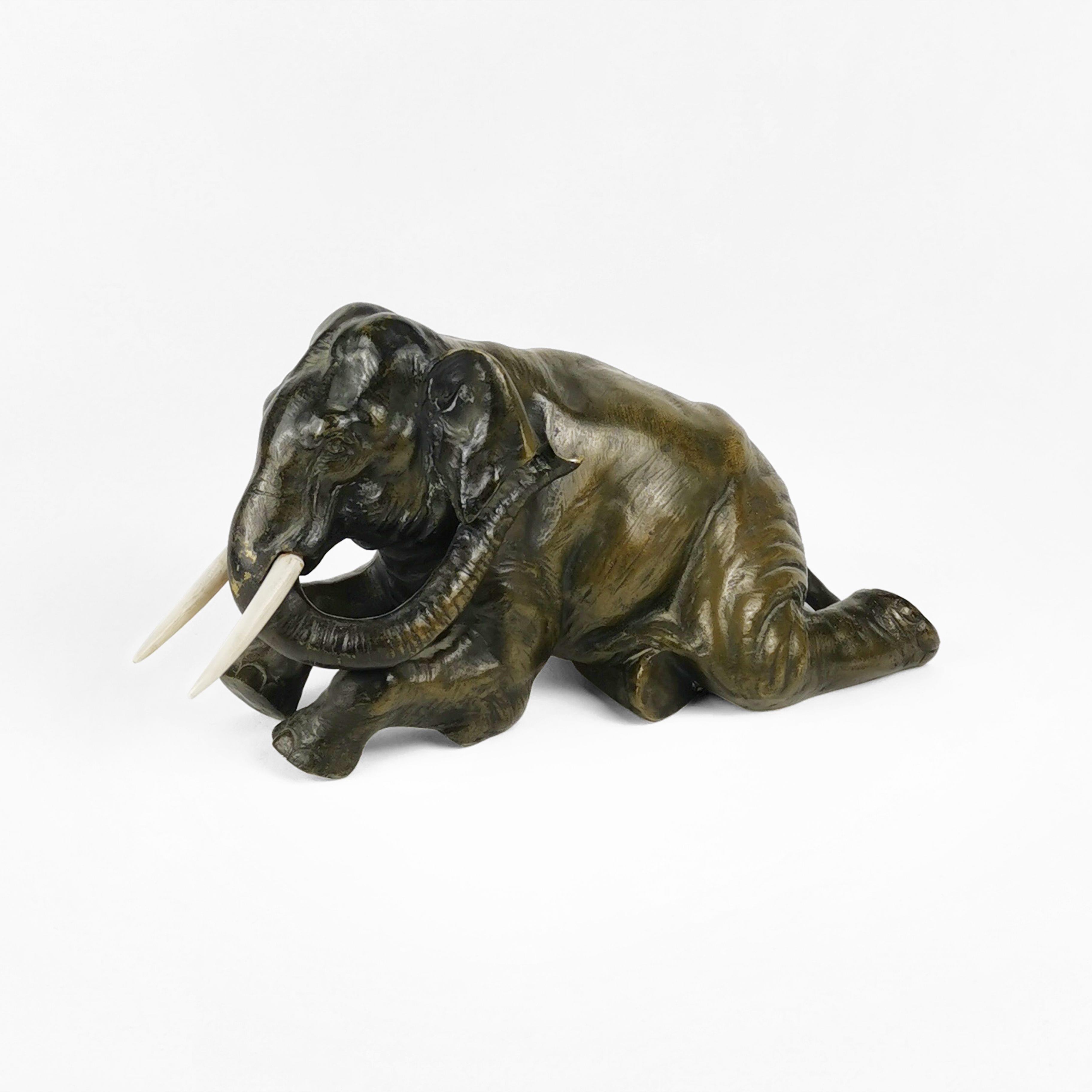 Éléphant allongé, bronze à patine médaille, L 22 cm