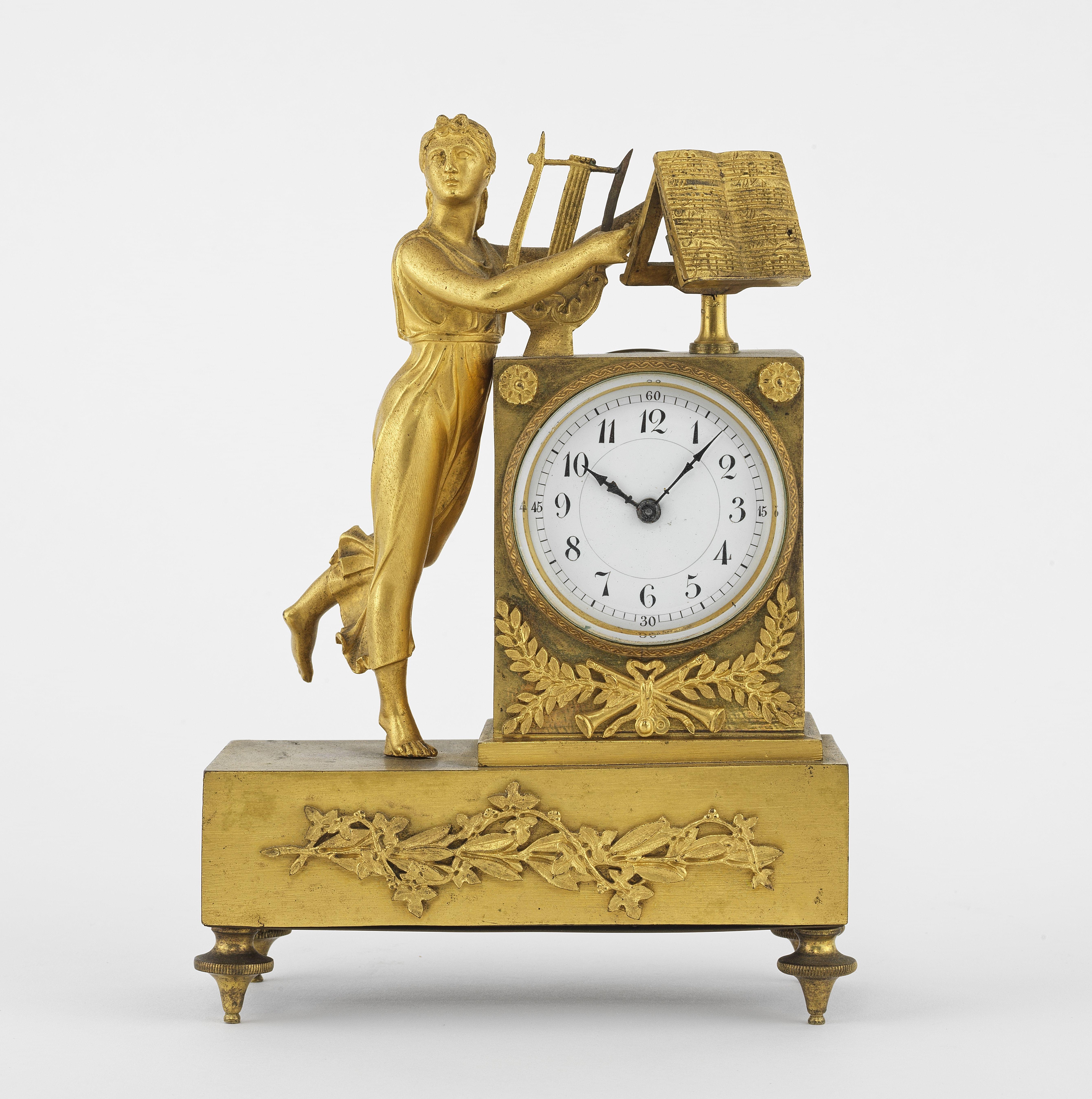 201. Pendule d'époque Empire surmontée d'une figure allégorique, cadr...