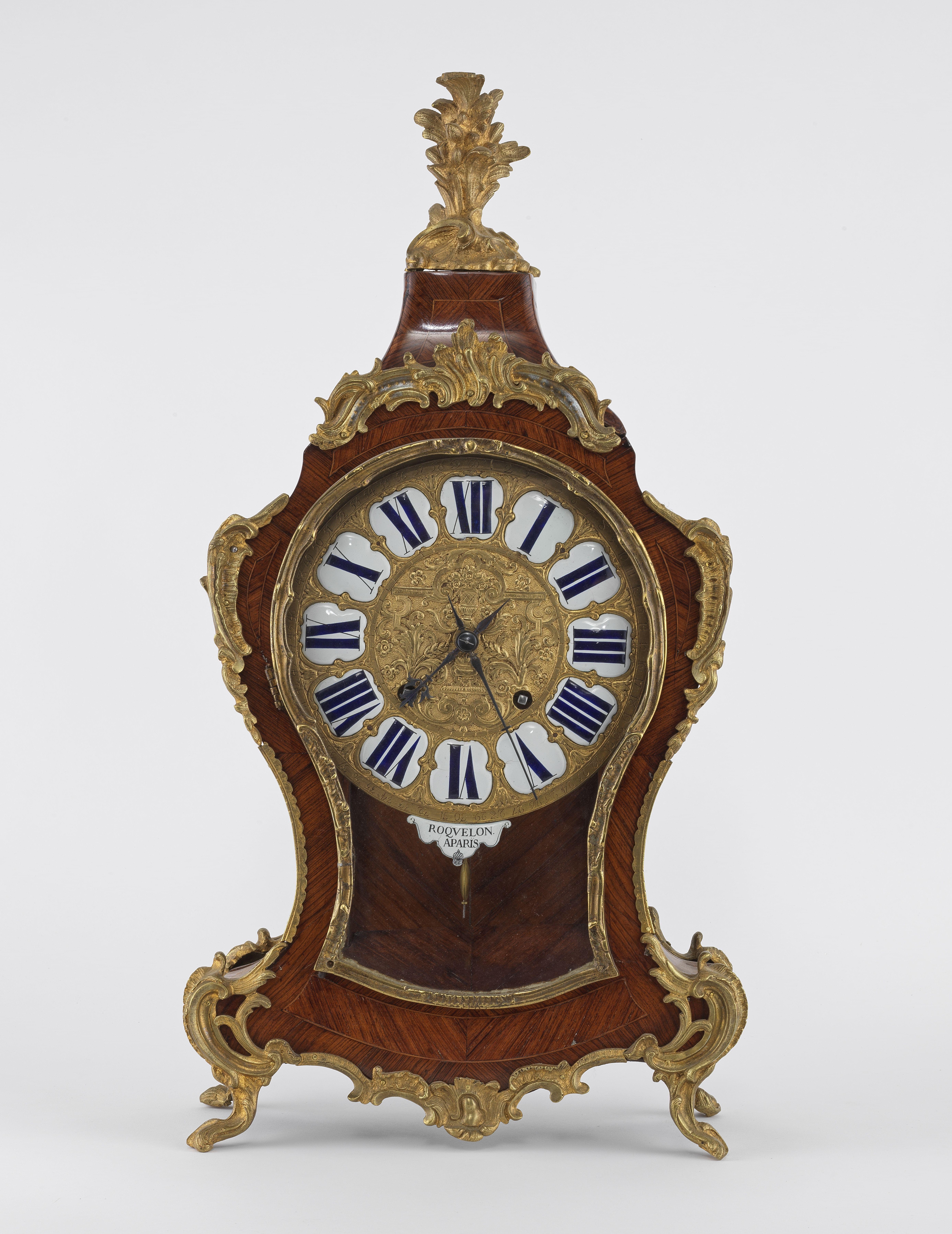 Placage de bois de rose et bronze doré, cadran en bronze doré et émaillé blanc aux chiffres romains signé Roquelon à Paris, H 72 cm