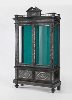 Bois laqué noir et or à motif de chinoiseries, deux tiroirs, bro...